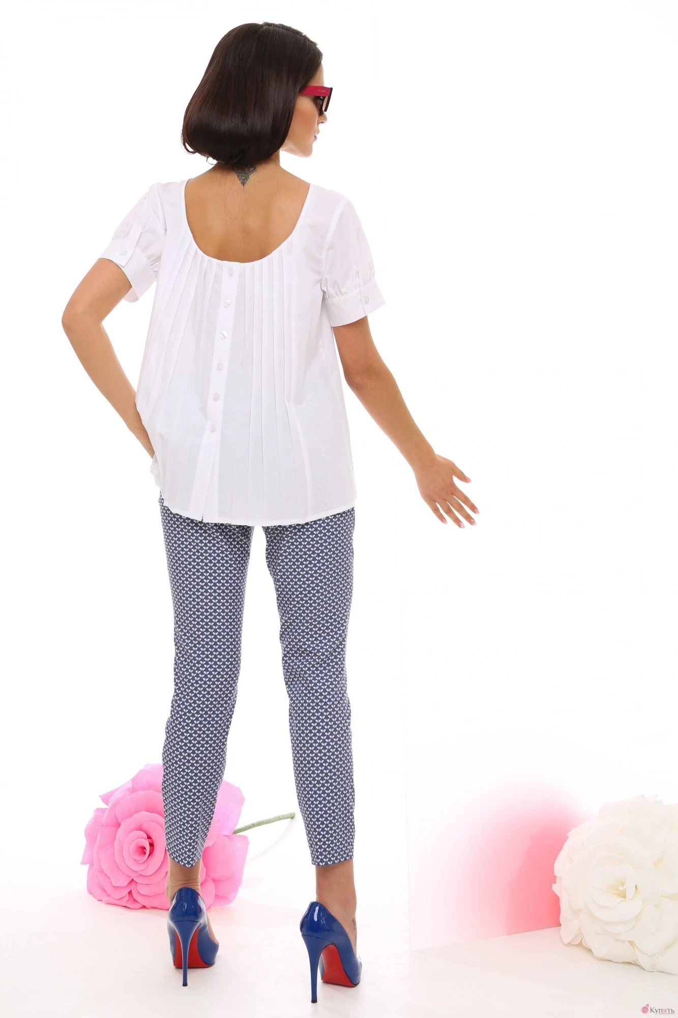 Стильная блузка, выполненная из хлопка. Особый интерес представляет складки на блузке. Спинка оформлена глубоким вырезом . По длине спинке застежка на пуговицах . Длина изделия-64см. Длина рукава -20м