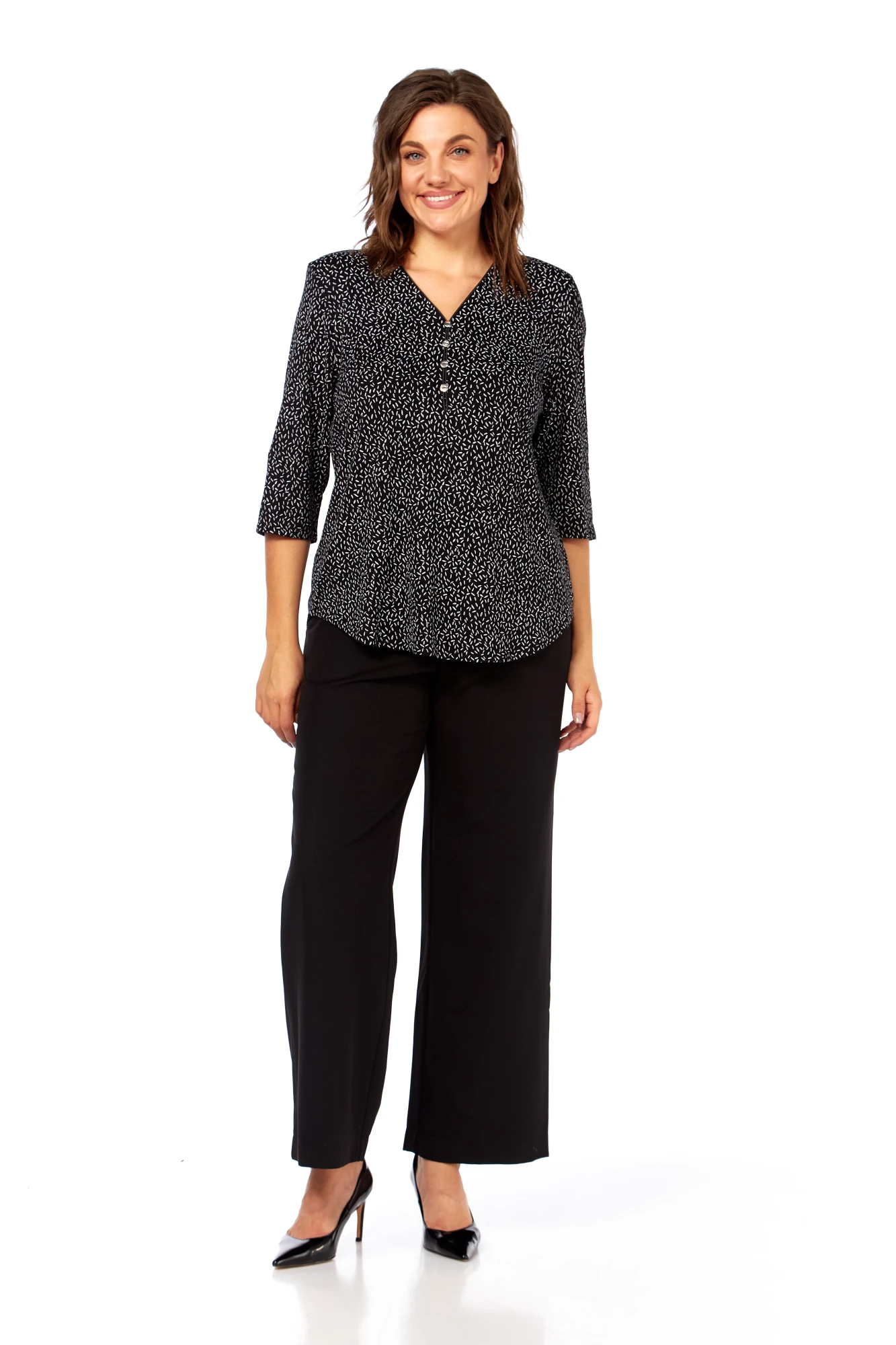 •Элегантный V-образный вырез с планкой: Глубокий V-образный вырез горловины изящно подчеркивает линию шеи и декольте, визуально удлиняя силуэт. Вдоль выреза расположена стильная декоративная планка с четырьмя круглыми пуговицами под матовое серебро, которые добавляют изделию акцент и напоминают классическую модель поло.