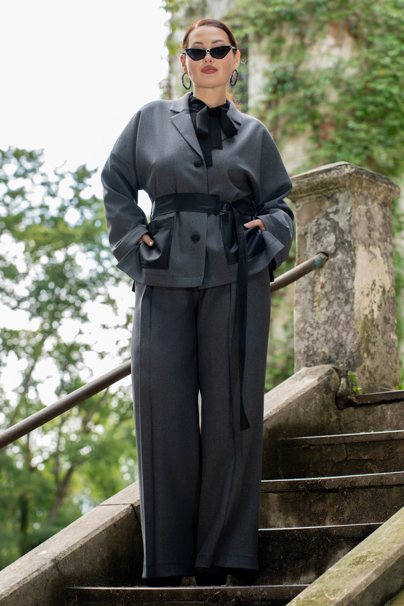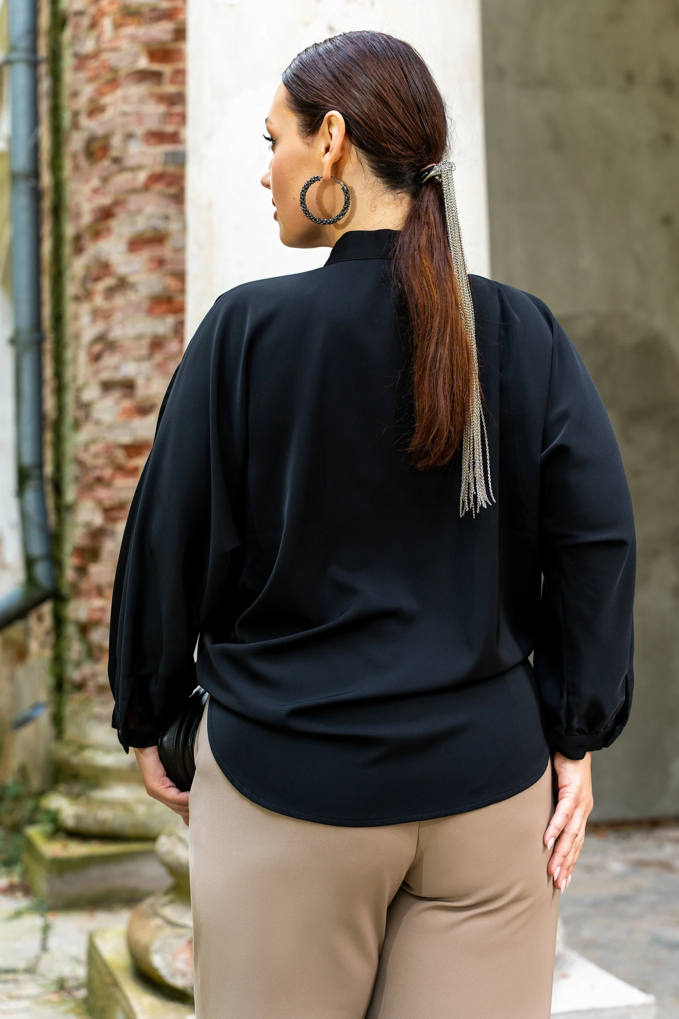 Элегантная женская блузка черного цвета, выполненная в стиле "летучая мышь", идеально подойдет как для торжественного мероприятия, так и для повседневной носки. Блузка со стойкой-завязкой, добавляющими изысканности образу. Цельнокроеные рукава с застежкой на петлю и пуговицу.Асимметричный низ блузки спереди короче, сзади длиннее, что придает дополнительный стиль. Эта блузка станет изысканным дополнением к вашему гардеробу.