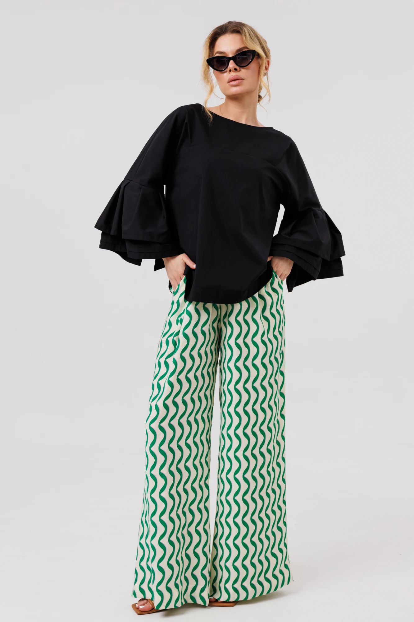 Блузка свободного силуэта (стиль оверсайз), на кокетке по переду и спинке. Рукав цельнокроенный. По низу рукава притачные воланы.