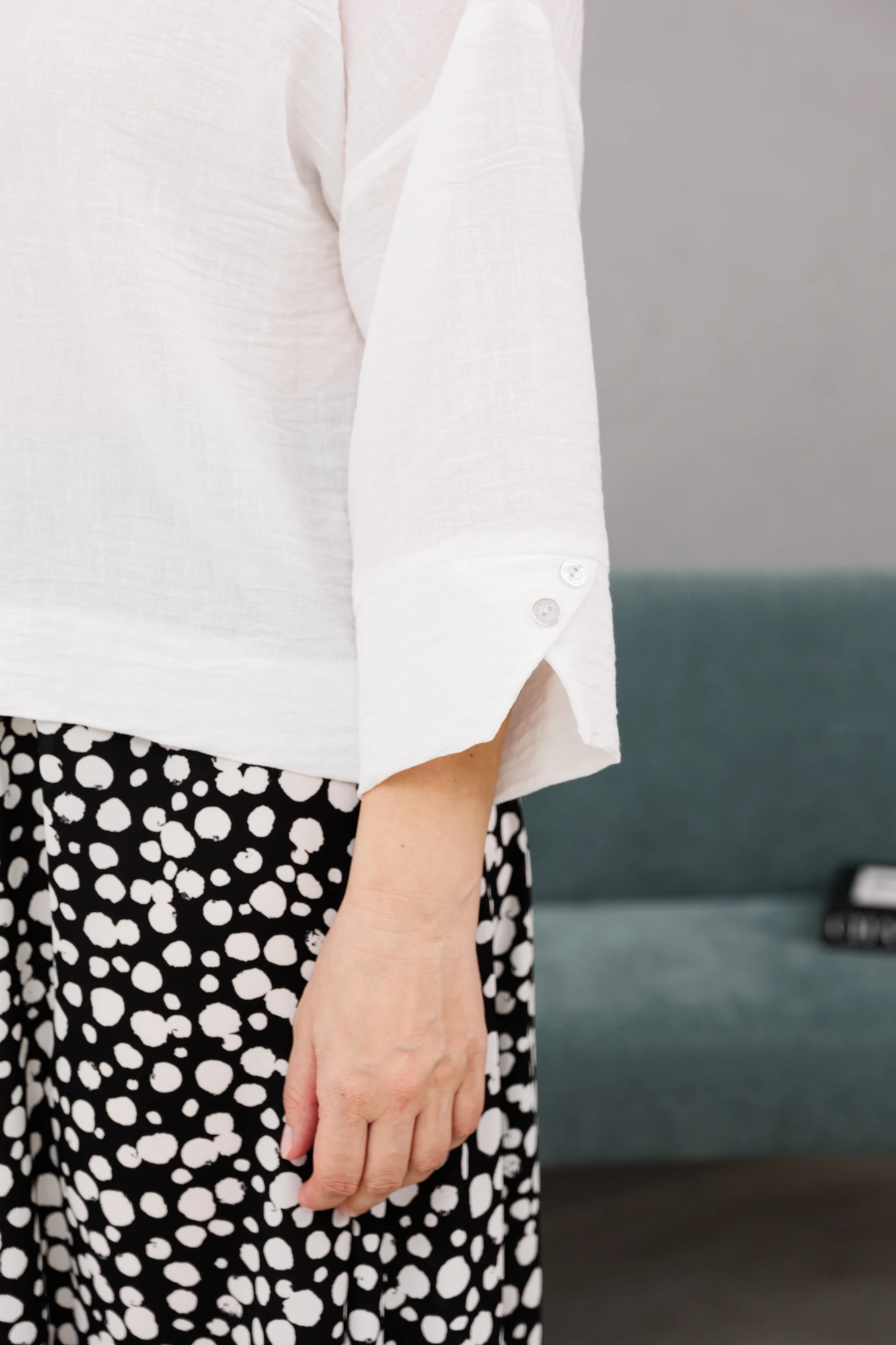 Блузка женская, прямого силуэта со спущенным плечом. Благодаря своему крою станет базовой вещью в вашем гардеробе. Легко сочетается с любыми брюками, юбками, платьями и джинсами. Позволит создать большое количество образов для офиса, прогулок, праздничных мероприятий. Застежка- планка на петли и пуговицы. Воротник на отрезной стойке. Рукав одношовный, втачной, 3/4 длины с манжетой. В качестве декора- по манжете пуговицы, по низу блузки широкая подгибка с отстрочкой.