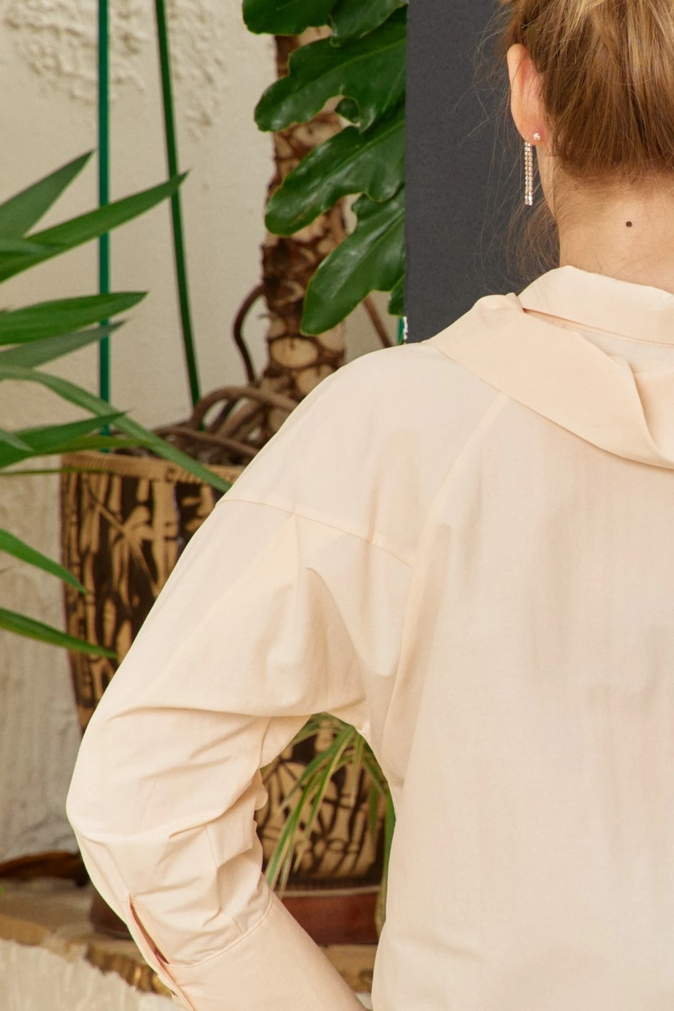 Блузка женская с акцентным декором полуприлегающего силуэта. Рукав "летучая мышь" с подрезом по линии проймы и односторонними складками и манжетой. Застежка- планка на петли и пуговицы. Воротник стояче-отложной. В качестве декора - дополнительный воротник, плавно переходящий в цветок. Благодаря своему крою станет базовой вещью в вашем гардеробе. Легко сочетается с любыми брюками, юбками, платьями и джинсами. Позволит создать большое количество образов для офиса, прогулок, праздничных мероприятий.