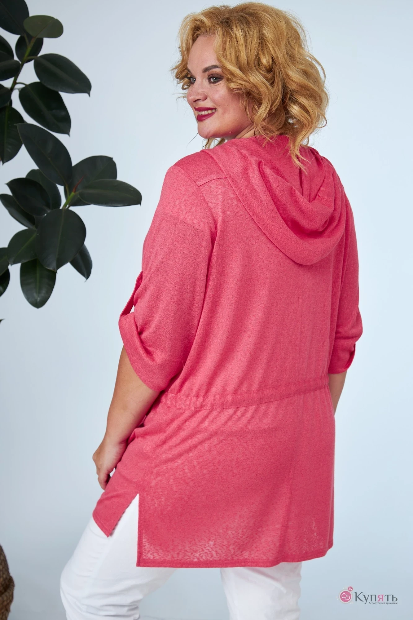 Блуза из трикотажного полотна прямого силуэта, удлиненная. По переду- нагрудная вытачка. По спинке кокетка по линии талии настрочена кулиса с протянутым шнуром и с 2-мя фиксаторами. В горловину втачан капюшон. Капюшон стачной, по краю вставлена резинка-1 см. Рукав втачной, одношовный. По низу рукава -широкая подгибка и пата. По переду - цельнокроенная планка с застежкой, спинка длинее полочки, по бокам разрезы. Длина блузона: в р.(50,52,54)-81 см, р.(56-60)-85см, р.(62-66)-86см. Длина рукава: в р.(50,52,54)-38 см, р.(56-60)-40см, р.(62-66)-42см.