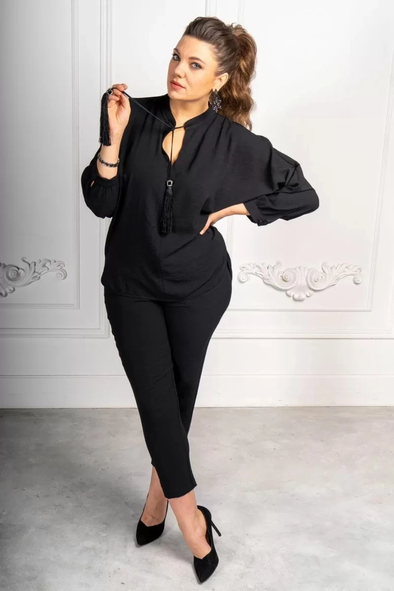Блузка женская как для праздников так и для любого повода, , покроя "летучая мышь" , со стойкой на которую настрочена завязка с декоративными кисточками из бахромы, со швом по центру полочки, рукава цельнокроёные, застёгивающиеся на петлю и пуговицу. низ блузки по спинке длиннеее, по полочке короче.