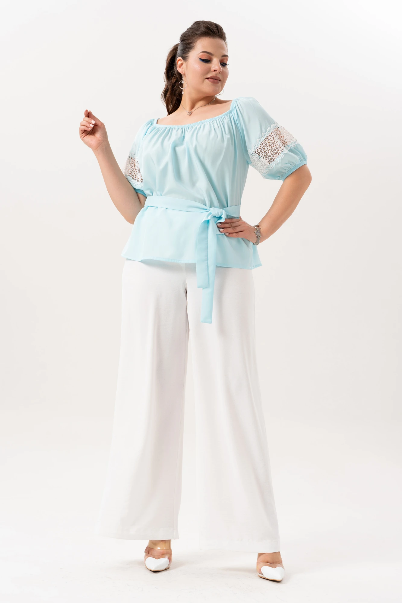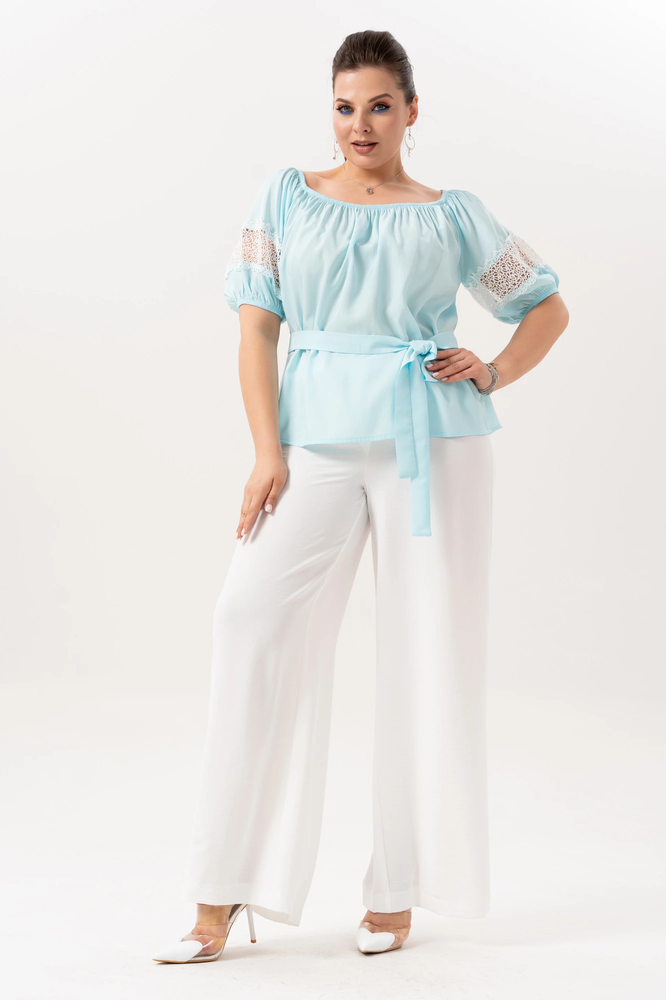 Блузка с рукавами покроя ""реглан"", горловина блузка с эластичной резинкой, что позволяет носить блузку на плечах и с открытыми плечами. Рукава реглан, свободные 3/4, по низу с эластичной резинкой.блузка со съёмным поясом.
