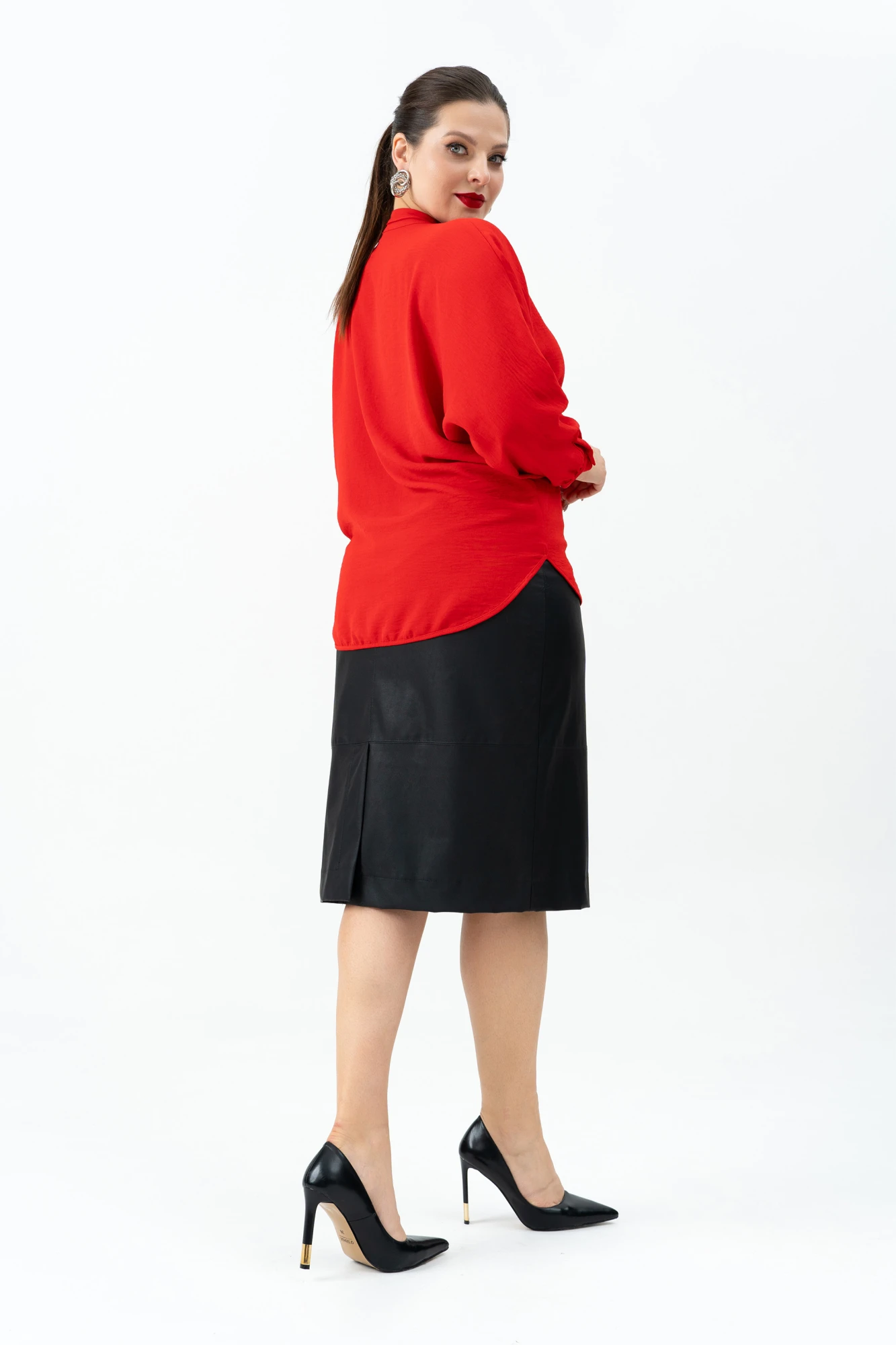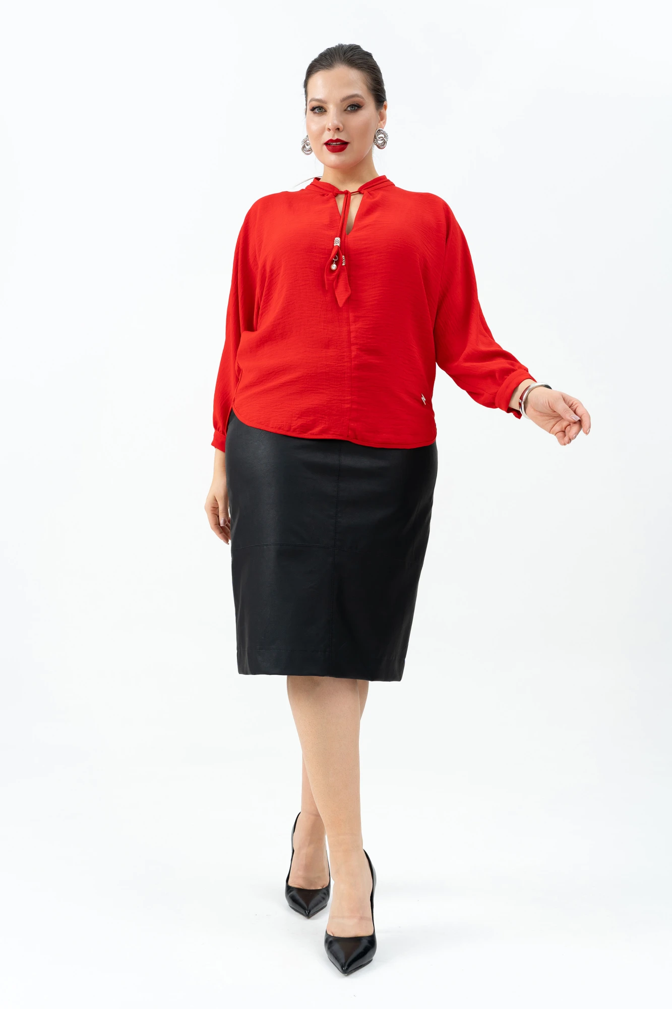 Блузка женская как для праздников так и для любого повода, покроя "летучая мышь" , воротник стойка на которую настрочена завязка с декоративными листиками с фурнитурой. Блузка со швом по центру полочки, рукава цельнокроёные, с притачными манжетами застёгивающимися на петлю и пуговицу. Низ блузки окантован , по спинке длиннеее, по полочке короче. Блузку можно носить как в заправленном виде, так и на выпуск.