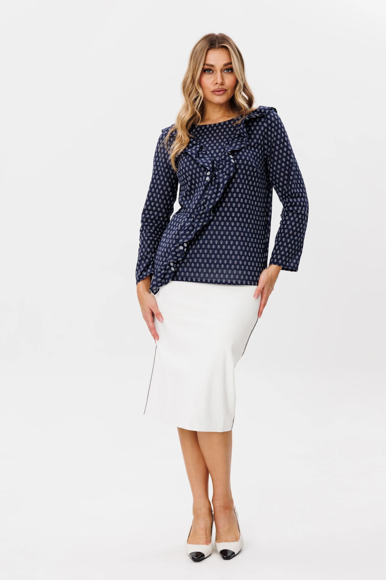 Эта хлопковая блузка с изысканным воланом станет настоящим акцентом вашего образа. Она выполнена в прямом силуэте с умеренным объёмом и средней длиной, что обеспечивает комфорт и стиль.
