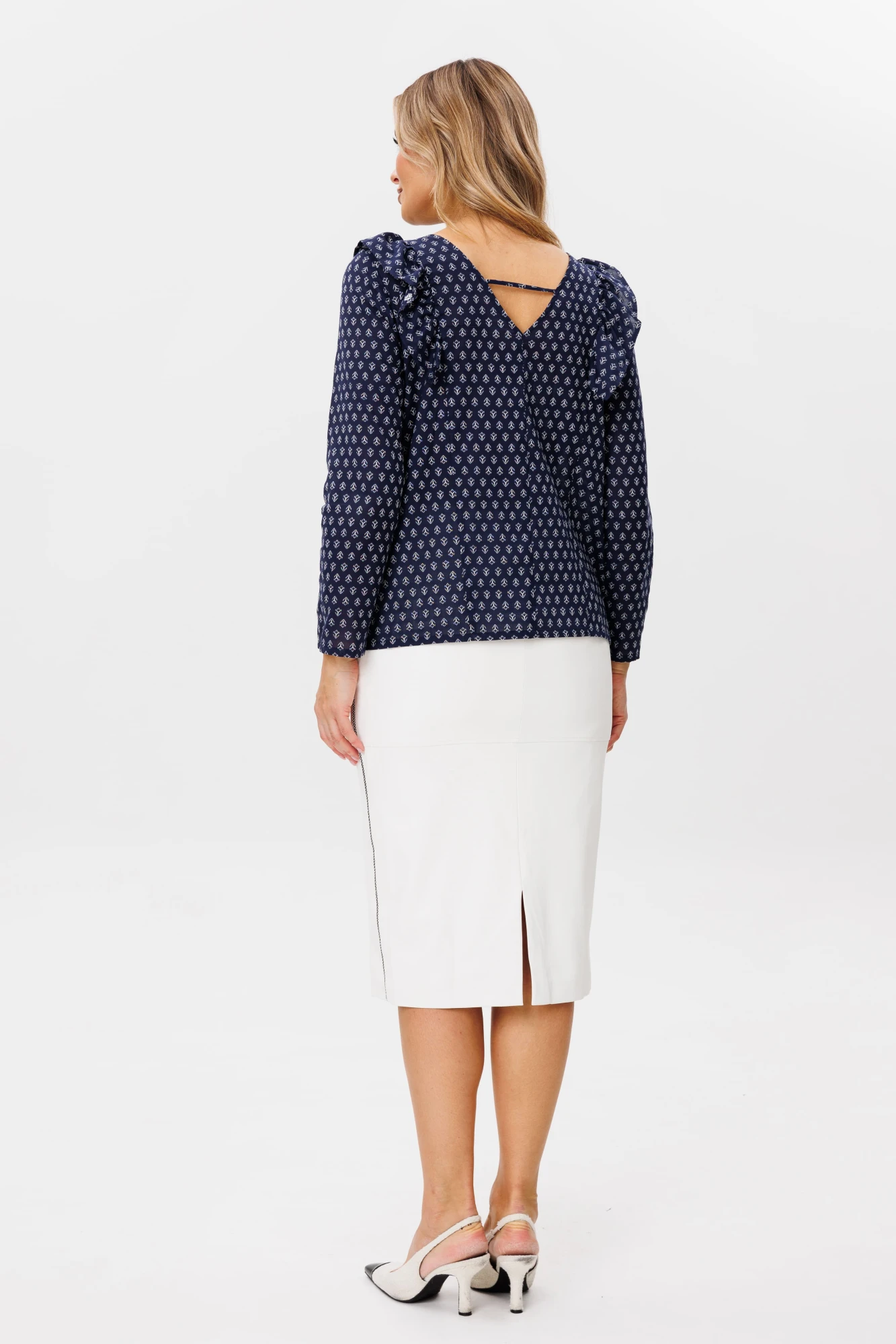 Передняя часть украшена V-образной кокеткой, которая плавно переходит в асимметричный рюш, создавая эффектный переход на спинку. Вырез на спинке также имеет V-образную форму, в то время как передняя часть завершена округлым вырезом, подчеркивающим линию шеи.