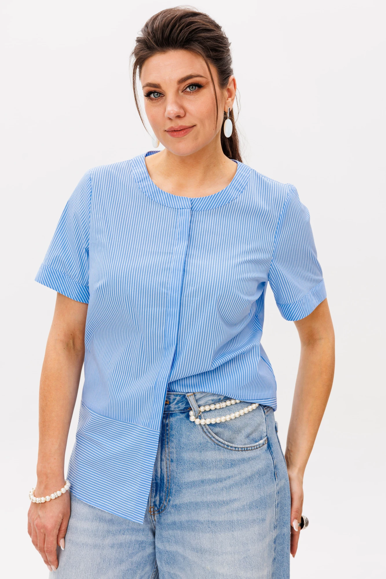 Идеальный баланс строгости и нежности: прямой силуэт с четкими нагрудными вытачками подчеркивает изящество линий, а мягкая стойка-обтачка обрамляет круглый вырез, добавляя утонченности. Игра контрастов в деталях — фигурные разрезы по низу блузы придают лёгкую динамику, а аккуратные манжеты на рукавах завершают образ с безупречной точностью. Потайная застежка сохраняет чистоту линий, а голубая полоска словно отражает летнее небо — свежо, воздушно, вне времени.