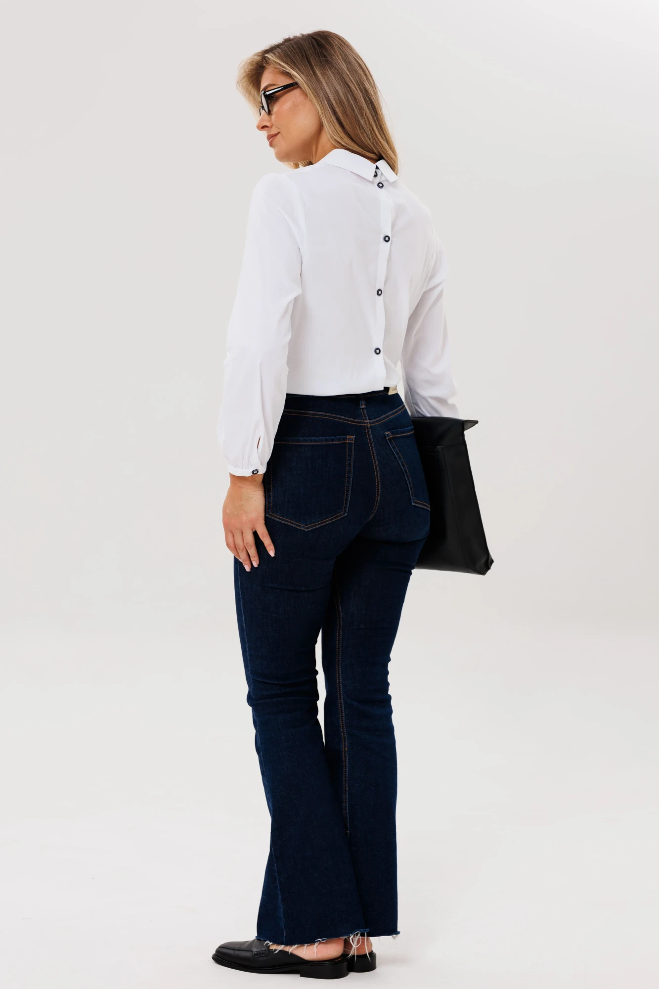Центральным элементом выступает скругленный воротник-стойка, утонченно обрамляющий линию шеи. Этот изящный акцент декорирован деликатной тесьмой, завязанной в элегантный бант насыщенного темно-синего цвета создавая тонкий и стильный контраст. Неожиданным и очаровательным решением является застежка на пуговицы, расположенная по линии спинки, что придает модели особый шарм и индивидуальность.
