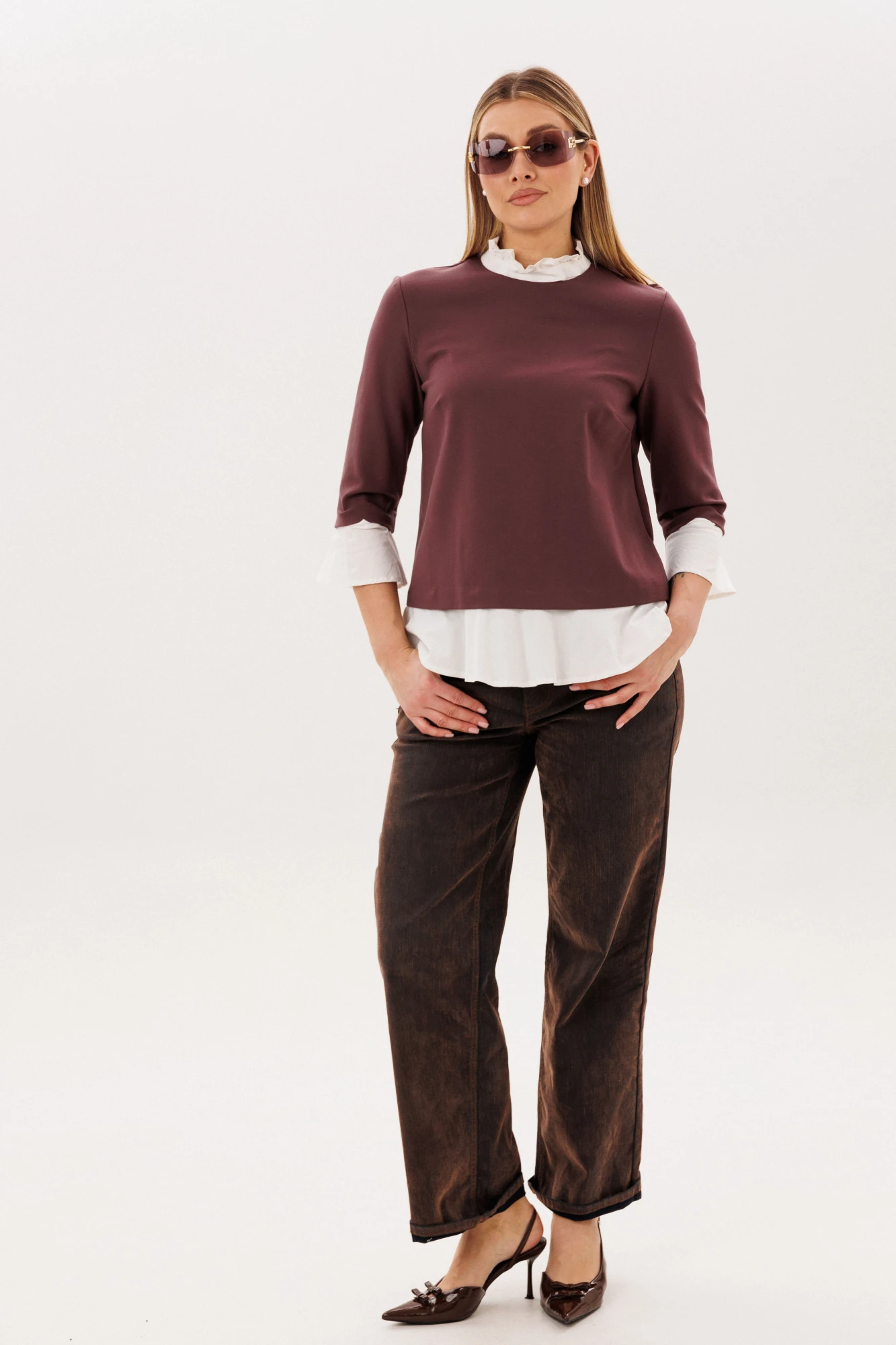 Полуприлегающий силуэт мягко подчеркивает фигуру, создавая утончённый и женственный образ, а рукав длины 3/4 добавляет лёгкости и делает блузу универсальной для любого сезона. Особую выразительность модели придают съёмные белые манжеты-накладки на рукавах и горловине - они словно освежают образ, добавляют контраст и нотку благородной изысканности. С ними блуза становится более нарядной и акцентной, а без них превращается в лаконичную базовую модель, которая легко вписывается в повседневный гардероб.