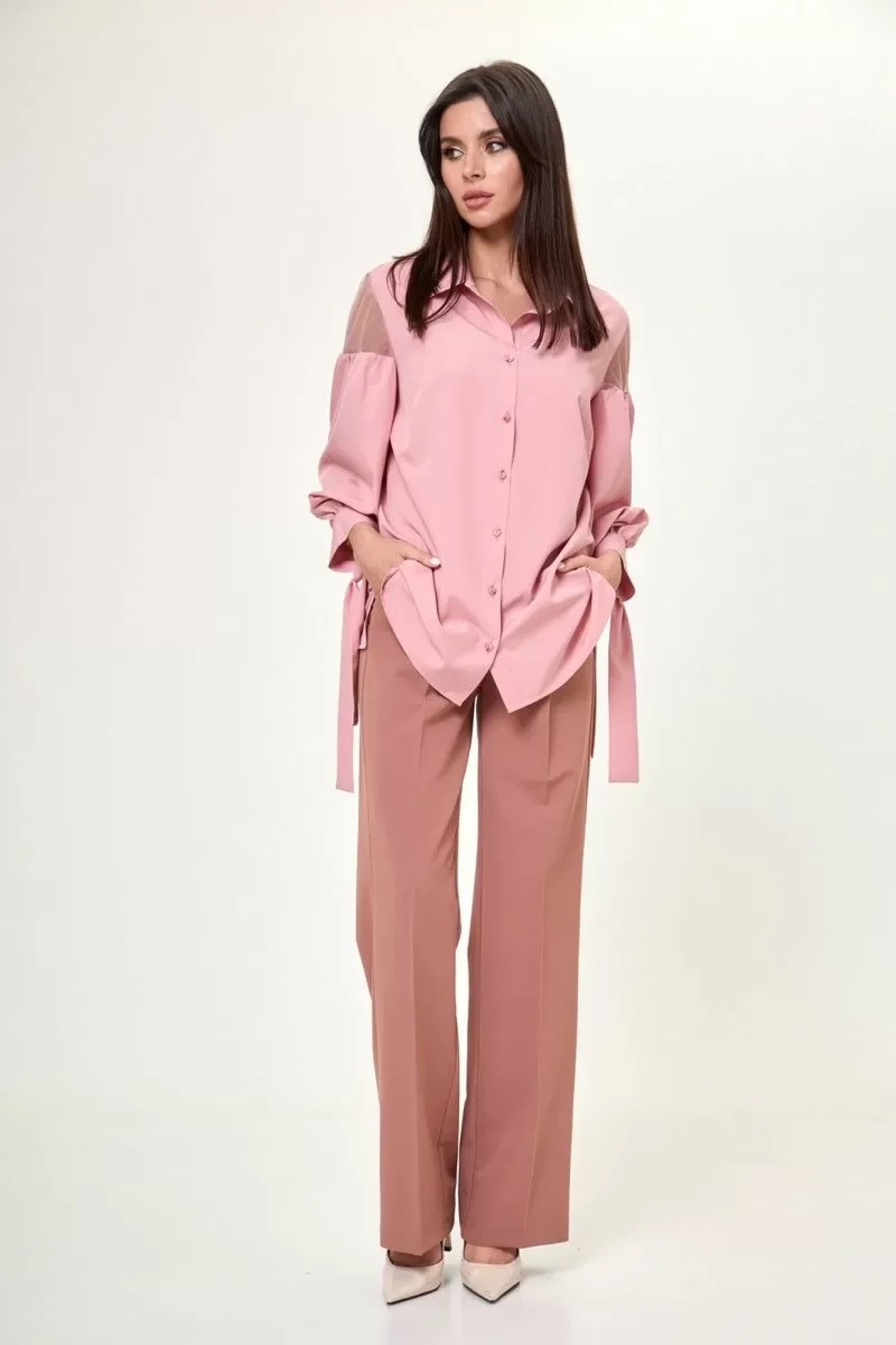 Особенностью и украшением блузы являются рукава, в верхней части которых вставлено хлопковое ажурное кружево. Низ рукавов присборен на манжетах, которые кокетливо завязываются на бант.