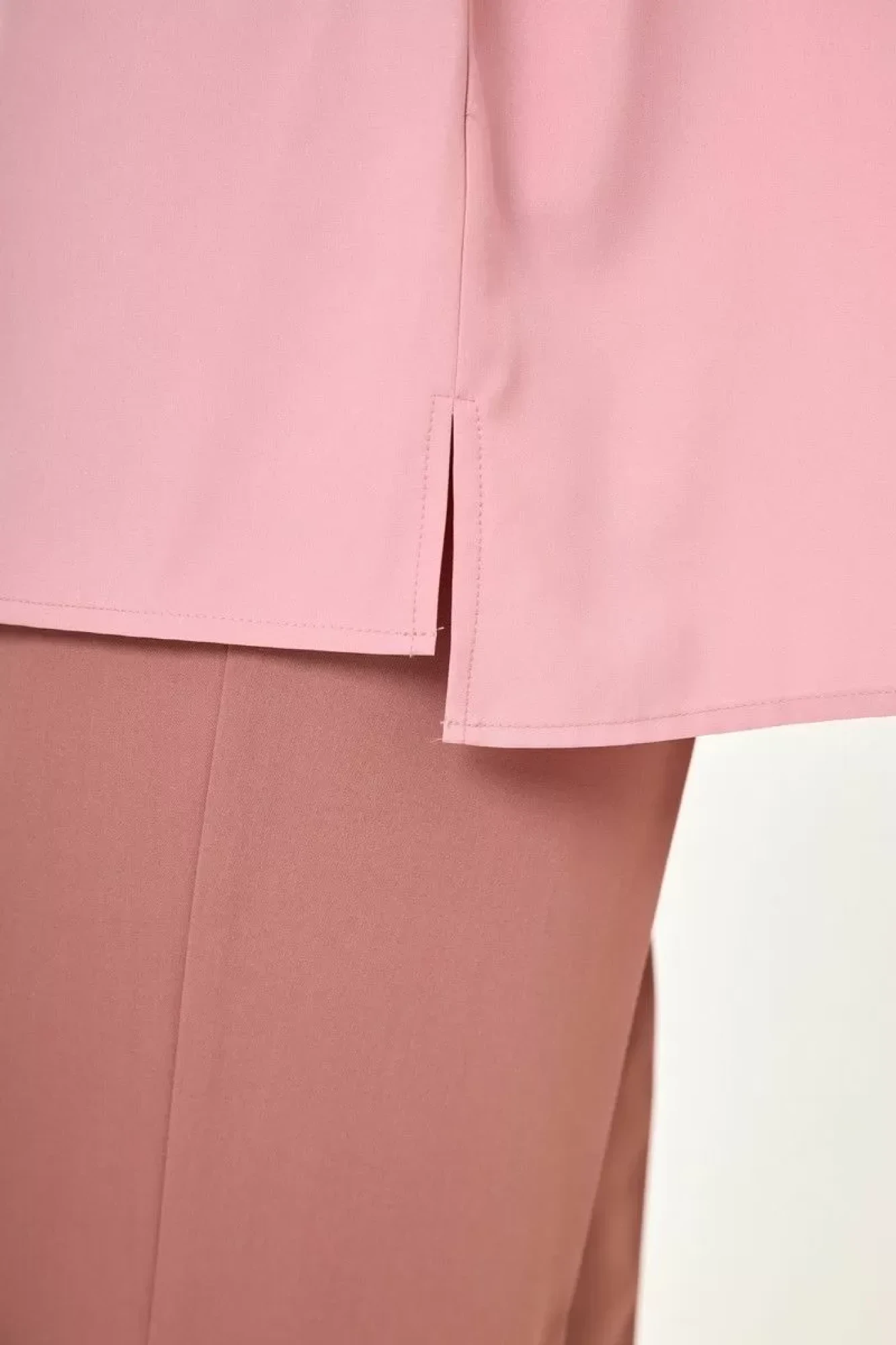 Прямой силуэт, втачной рукав, рубашечный воротник на стойке, функциональная застёжка на пуговицы по всей длине.