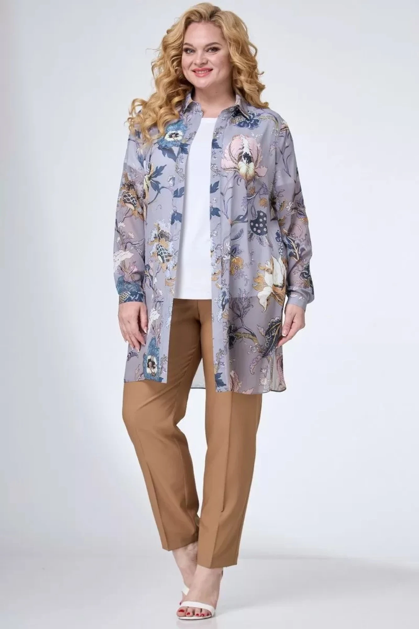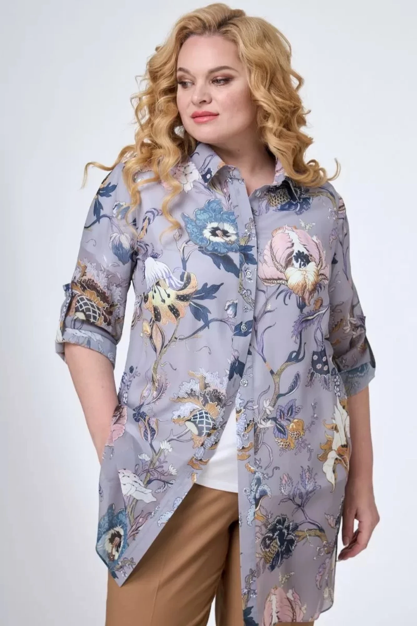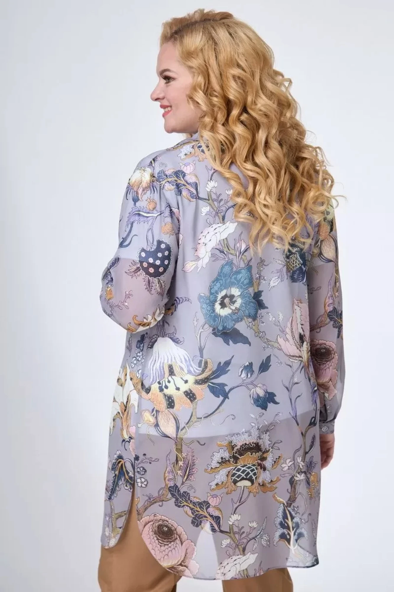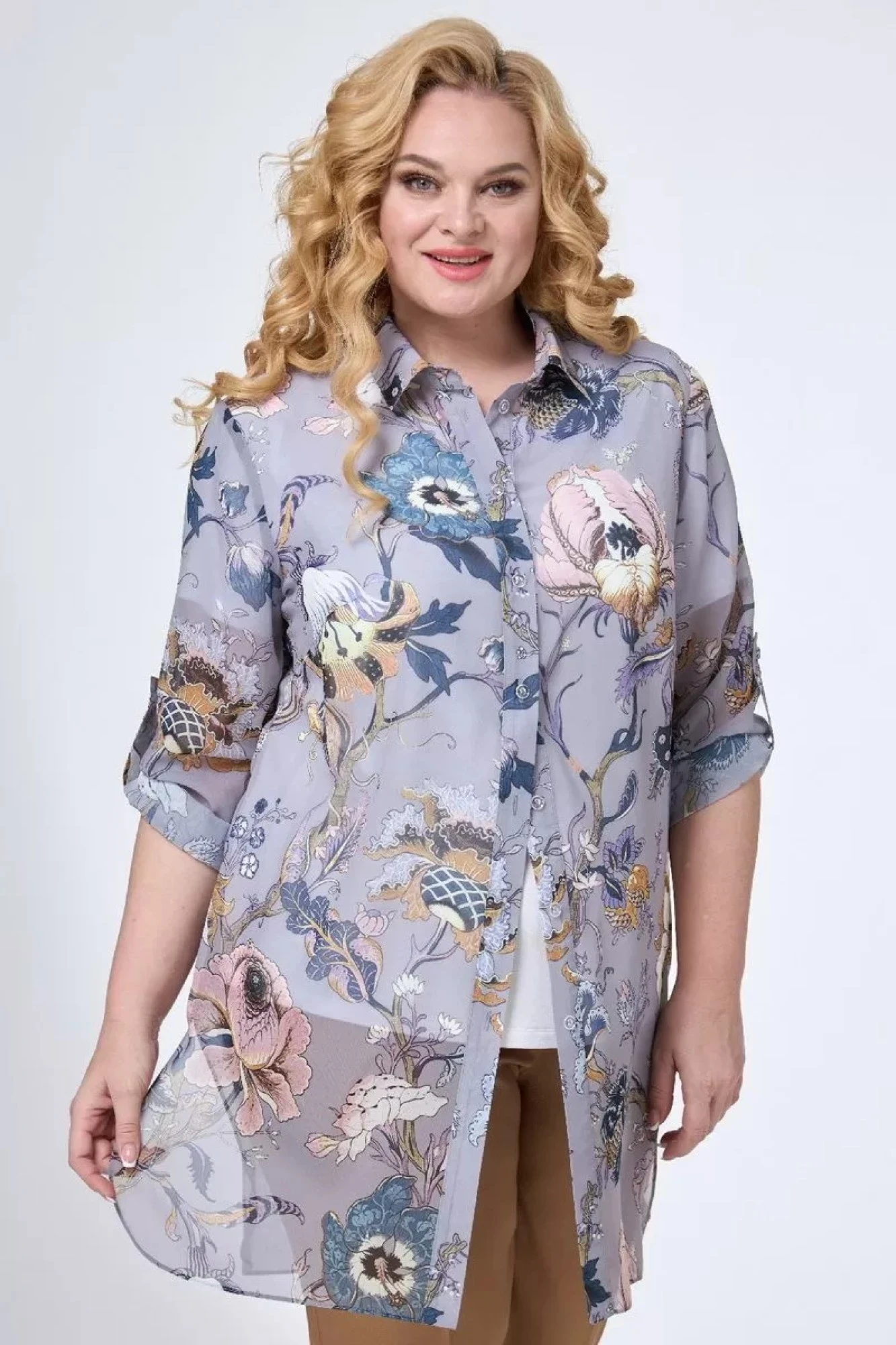 Блузка удлиненная прямого силуэта из шифоновой ткани. Воротник рубашечного типа на притачной стойке. Перед с центральной застежкой на петли и пуговицы на притачных планках. В боковых швах - разрезы. Рукав втачной длинный, с патой и на манжете с застежкой на пуговицу.