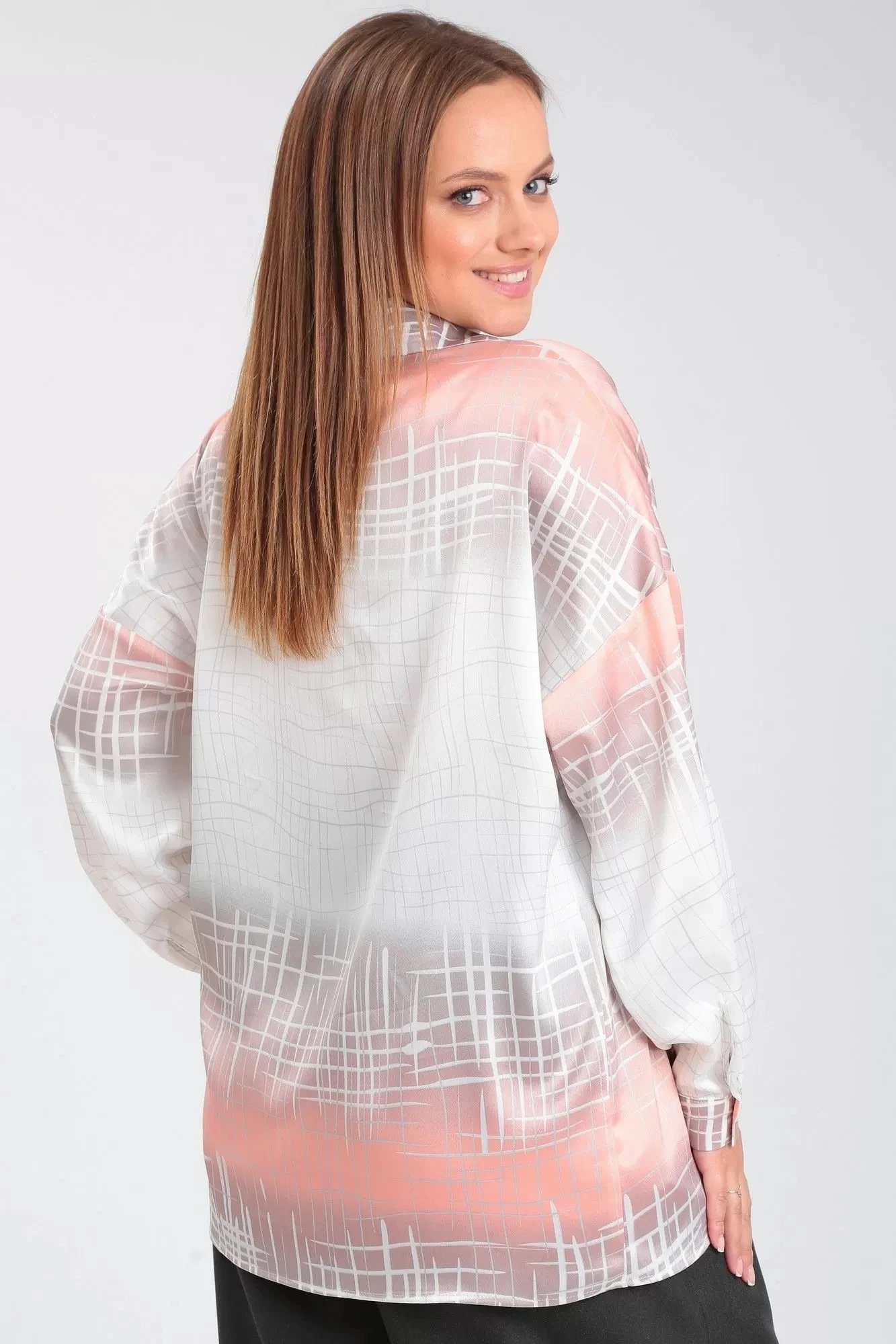 Блузка свободного силуэта. Воротник рубашечного типа на притачной стойке. По переду расположена центральная застежка на петли и пуговицы. Рукав втачной длинный со спущенной линией плеча, по низу на манжете с застежкой на петли и пуговицы."