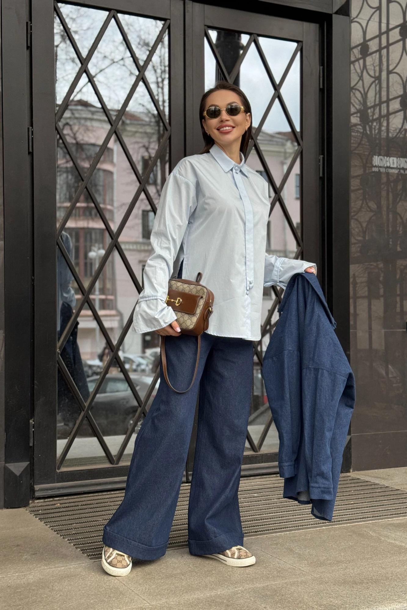 Блуза прямого силуэта с классическим воротником. Застёжка- планка с пуговицами. Плечевой шов спущен. Рукав обработан широкой манжетой, ширина манжеты регулируется шнурком из основном ткани. В комплекте есть деталь для фантазийного способа носки блузы, когда низ блузы перекрещивается внахлест и застегивается планкой, идущей в комлекте. Такой способ делает основной акцент на талии. Планка съёмнаяя. Носить блузу моно в класическом варианте.
