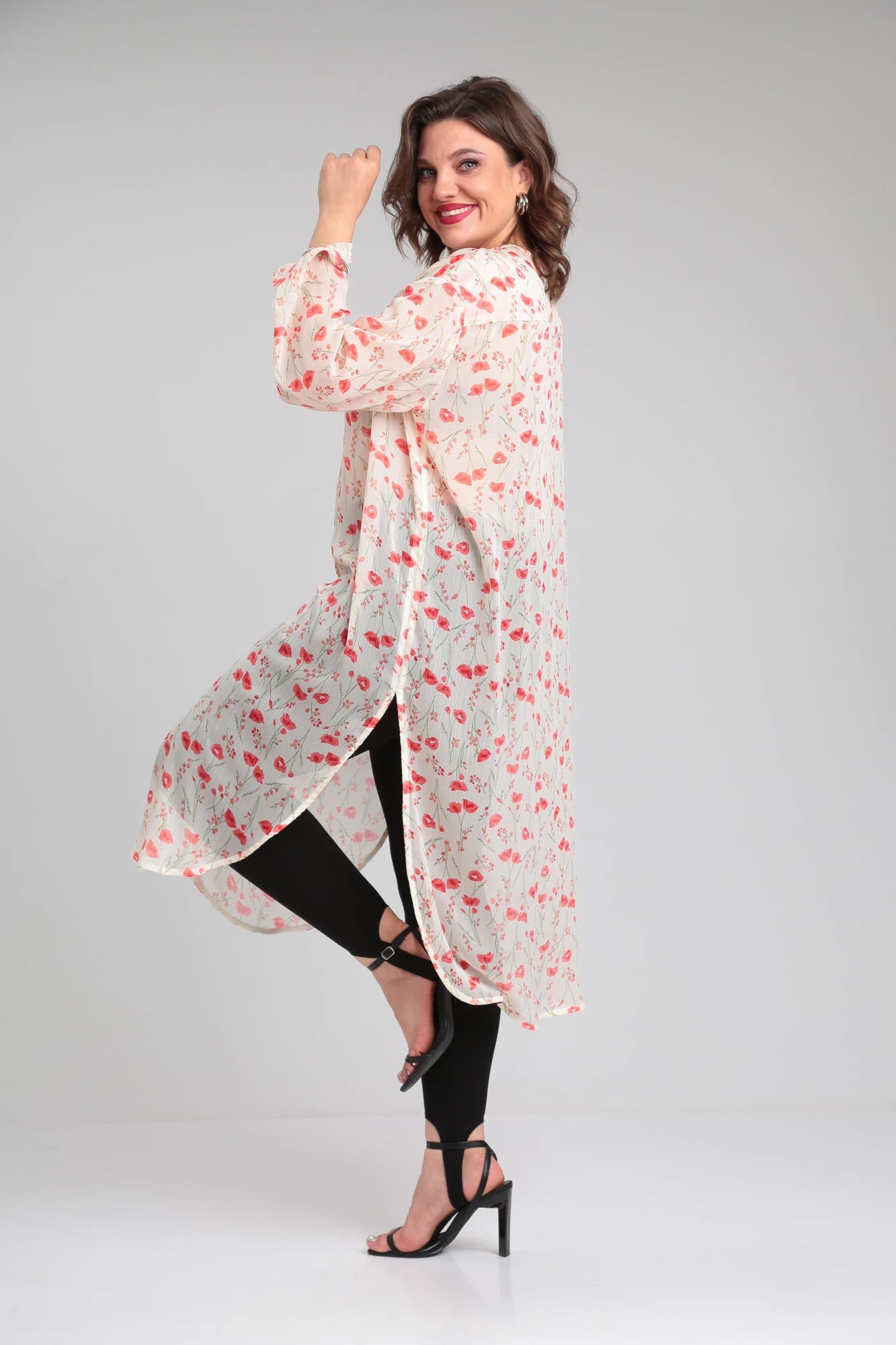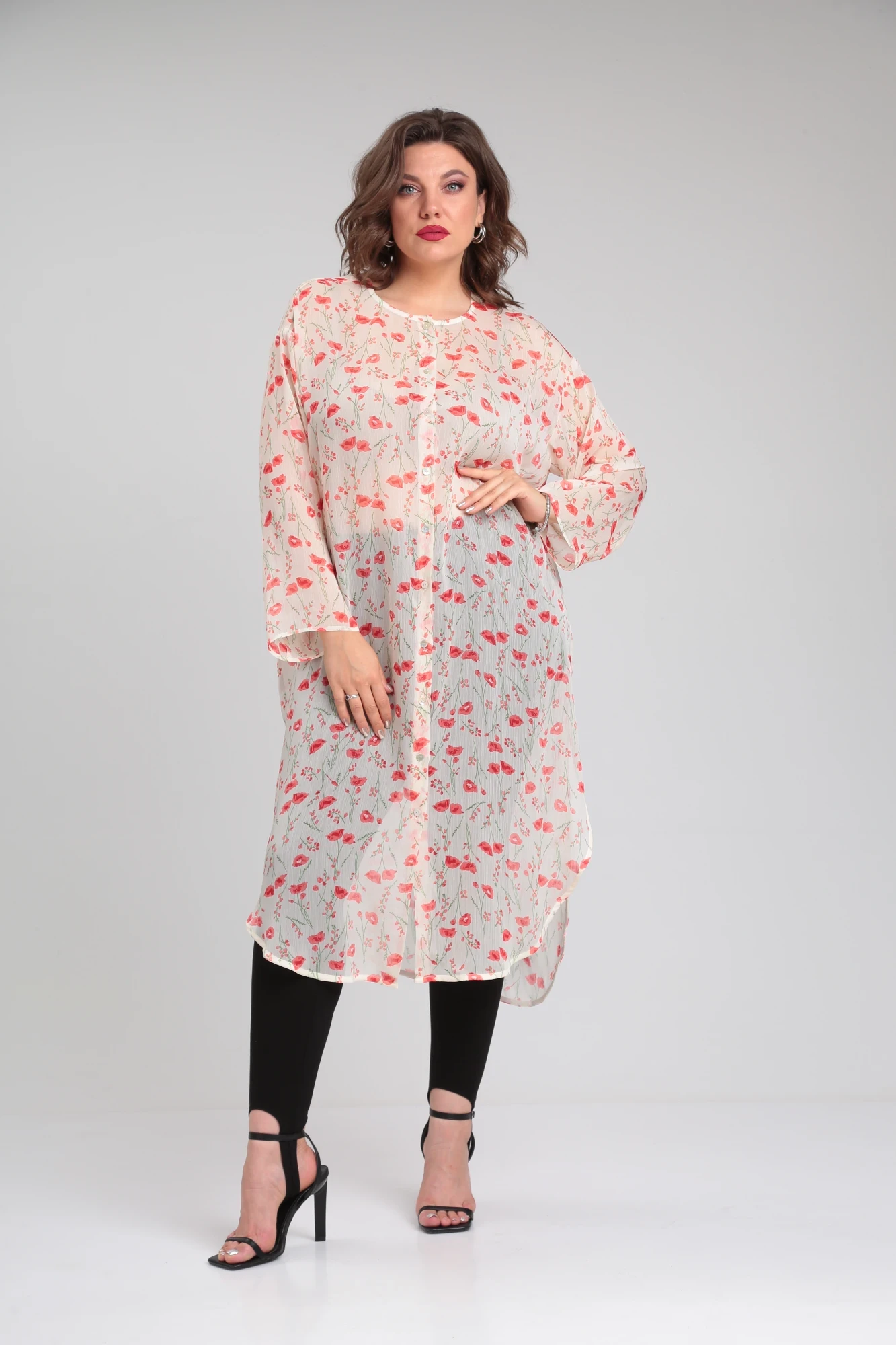 Блуза прямого свободного силуэта. Низа переда и спинки закруглены. Кокетка двойная, спущенное плечо, рукав прямой, укороченный. На переде центральная застежка на петли-пуговицы, горловина закругленная. Длина по спинке-122см, длина плеча-21см, длина рукава-50см.