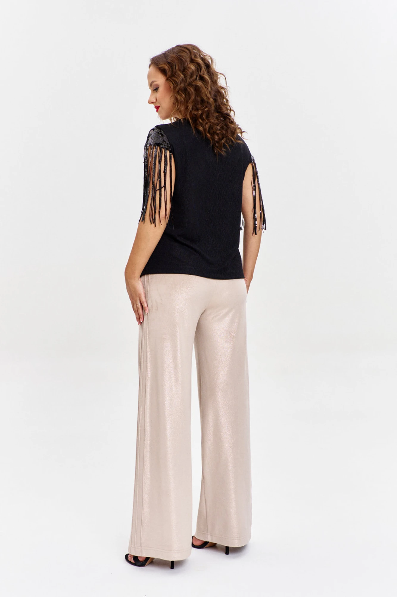 Джемпер из эластичного трикотажа с легким мерцанием, полуприлегающего силуэта, с коротким рукавом и V-образной горловиной. Рукава из сетки с пайетками с эффектной длинной бахромой.
