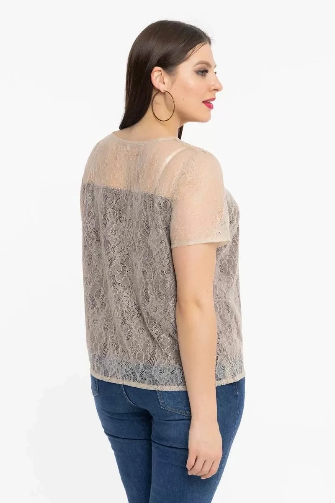 Кружевная блузка на подкладке, с коротким рукавом, округлой горловиной. Блузка станет отличным дополнением вашего повседневного и праздничного выхода.