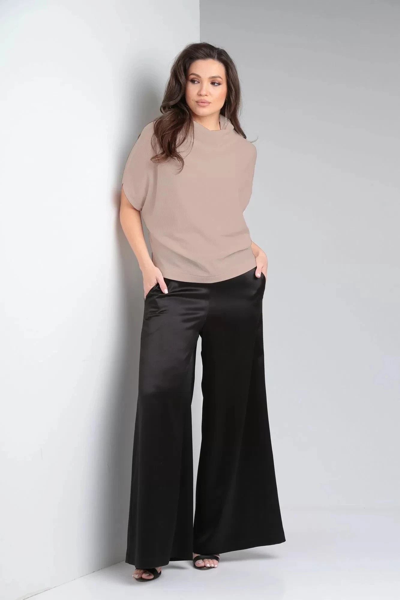Необычная блуза свободного силуэта со свободным спущенным плечом, коротким рукавом типа «летучая мышь» и цельнокроеным воротником стойкой. Выполнена из приятного к телу текстурного материала. Это изделие можно носить как самостоятельно, так и под базовую рубашку, гольф. Блузка выгодно скрывает недостатки и подчеркивает достоинства, подойдет девушкам с любым типом фигуры. Разнообразить образ также можно с помощью различных ярких аксессуаров.