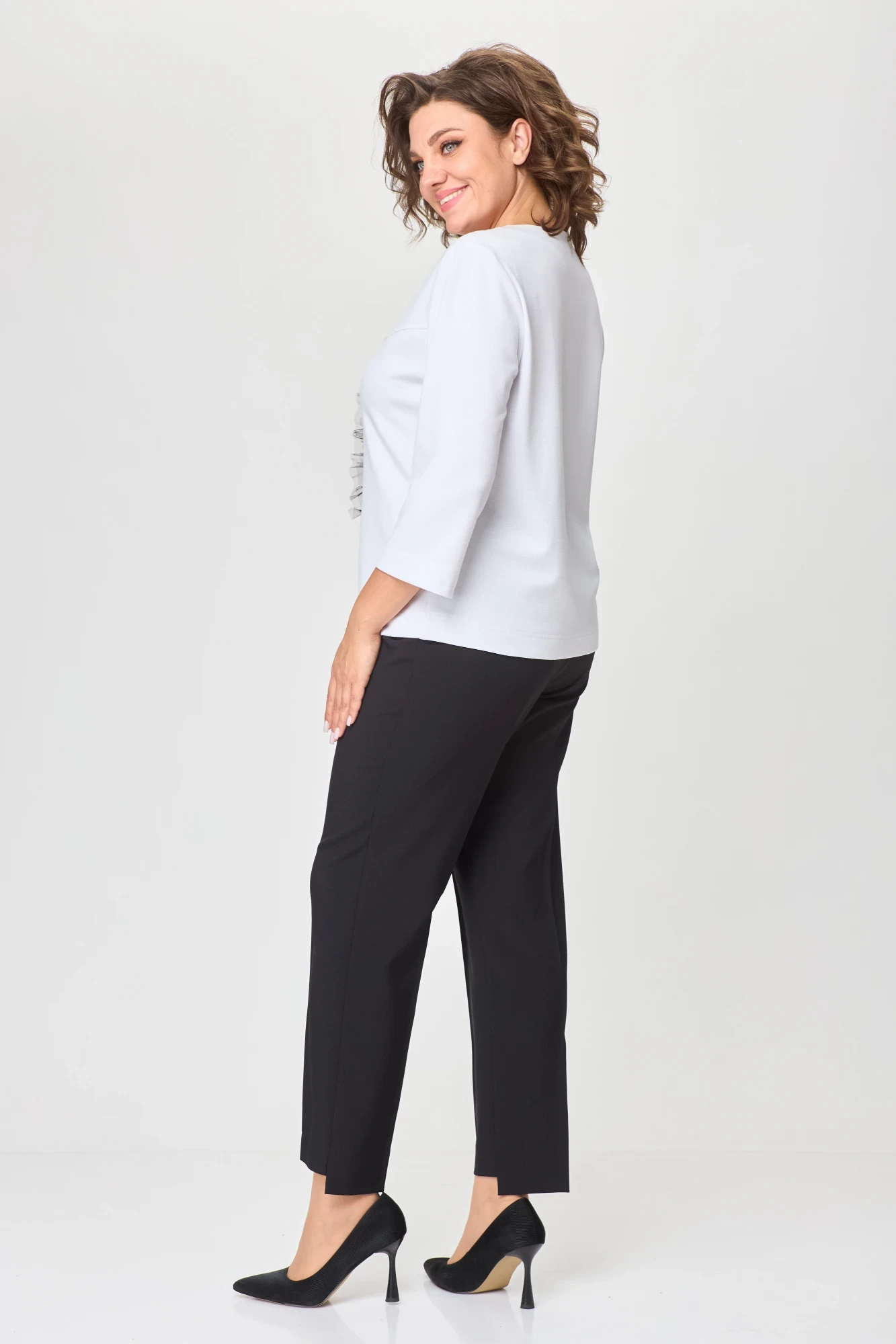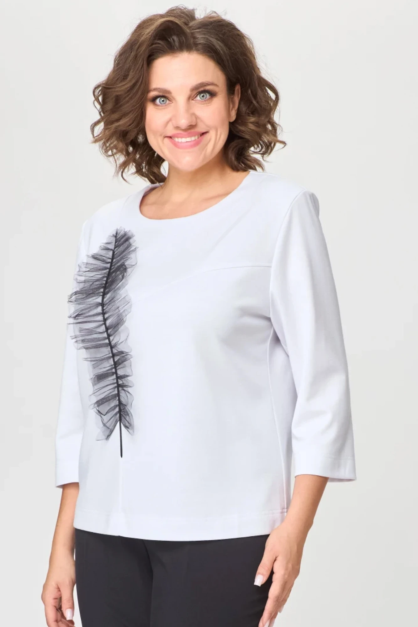 Блуза женская, трикотажная. Эта модель создана из мягкого трикотажного полотна, что обеспечивает идеальное сочетание стиля и удобства. Блузка с декоративным элементом – перо, выполненным из фатина. Спинка цельнокроенная, перед с вертикальными и горизонтальными подрезами. Рукав втачной, одношовный. Длина – ¾. Трикотажная текстура материала и белый цвет позволяют сочетать ее с любыми цветами и разными вариантами брюк и юбок.