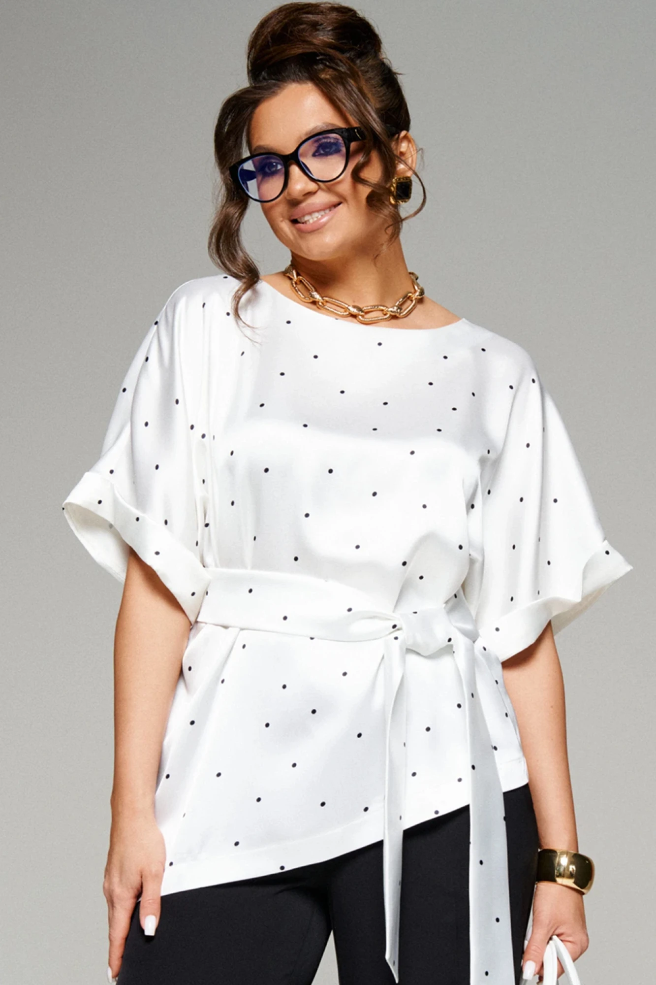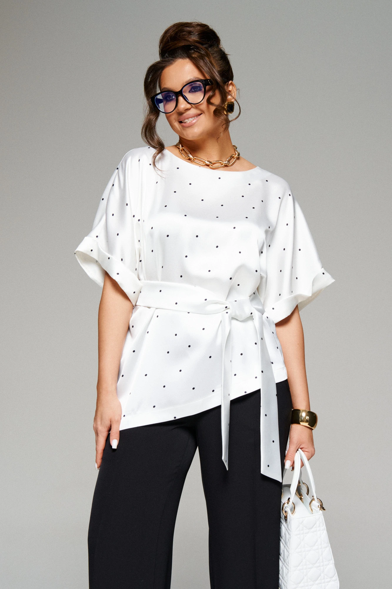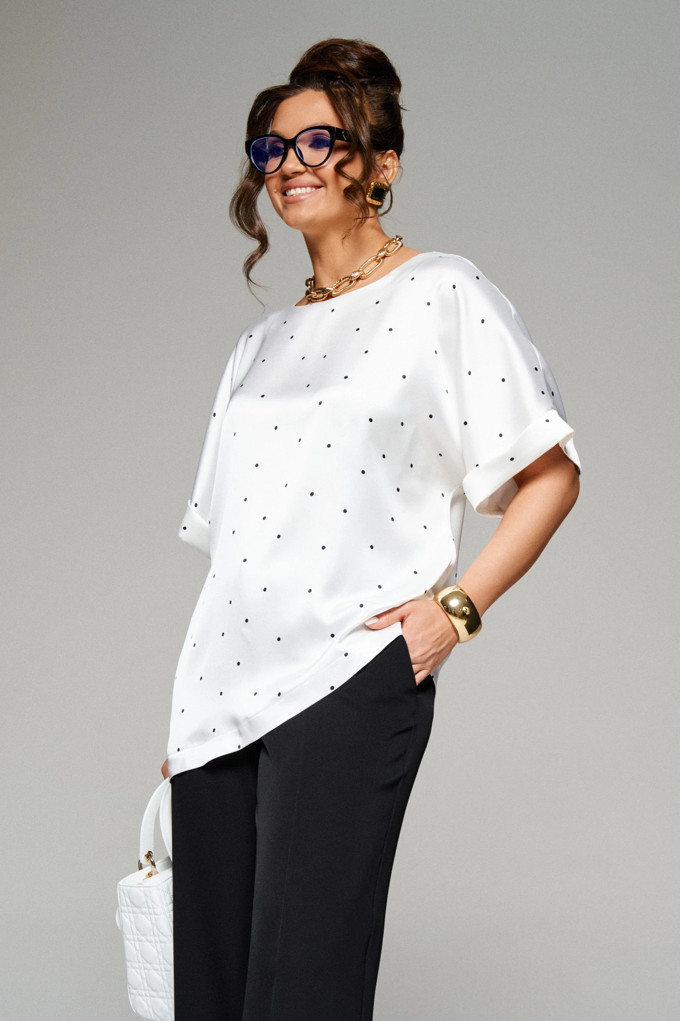 Блуза свободного кроя выполнена из ткани атлас, которая мягко облегает фигуру, а благодаря своему блеску придаёт изделию торжественный и презентабельный вид.