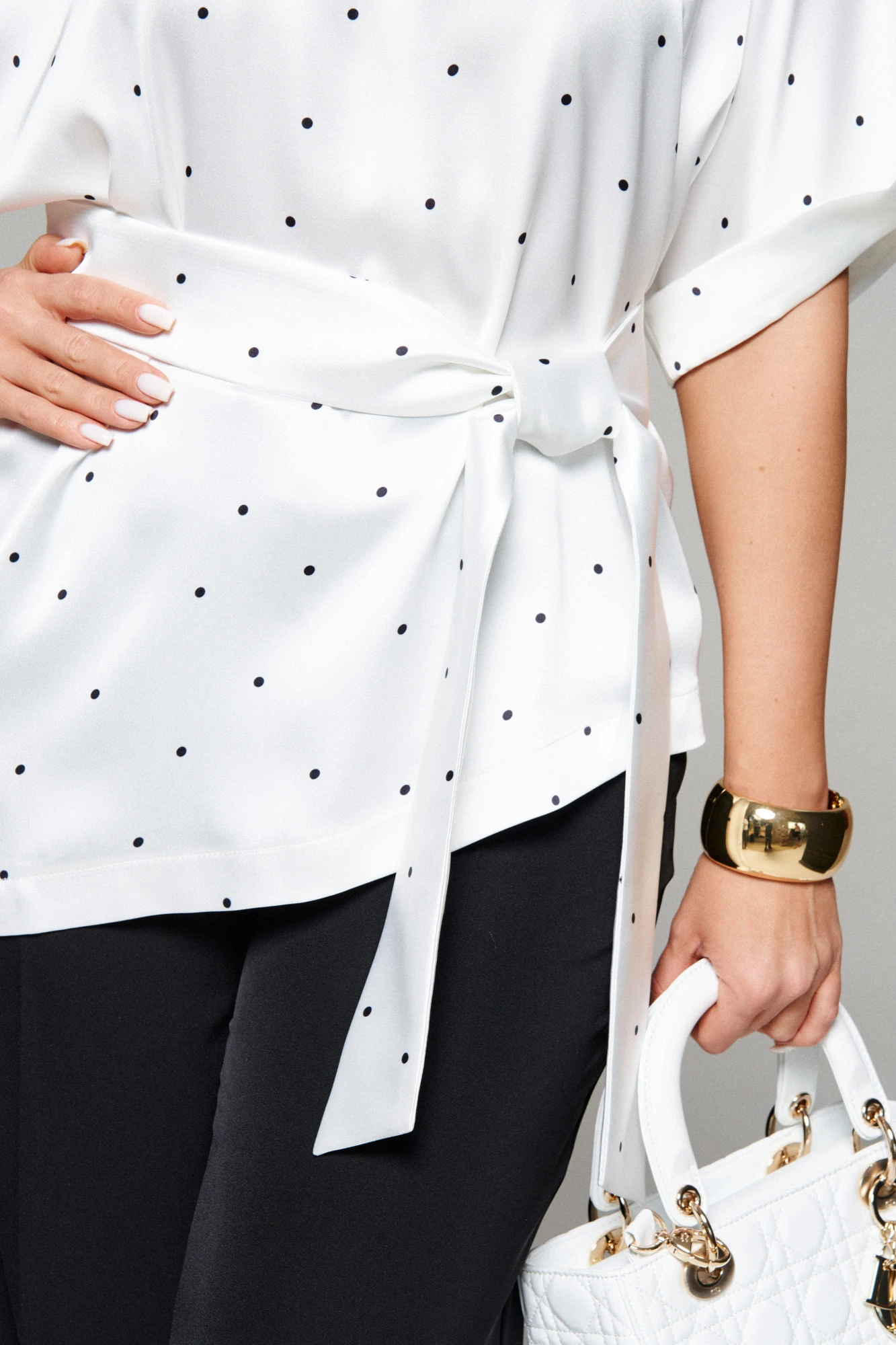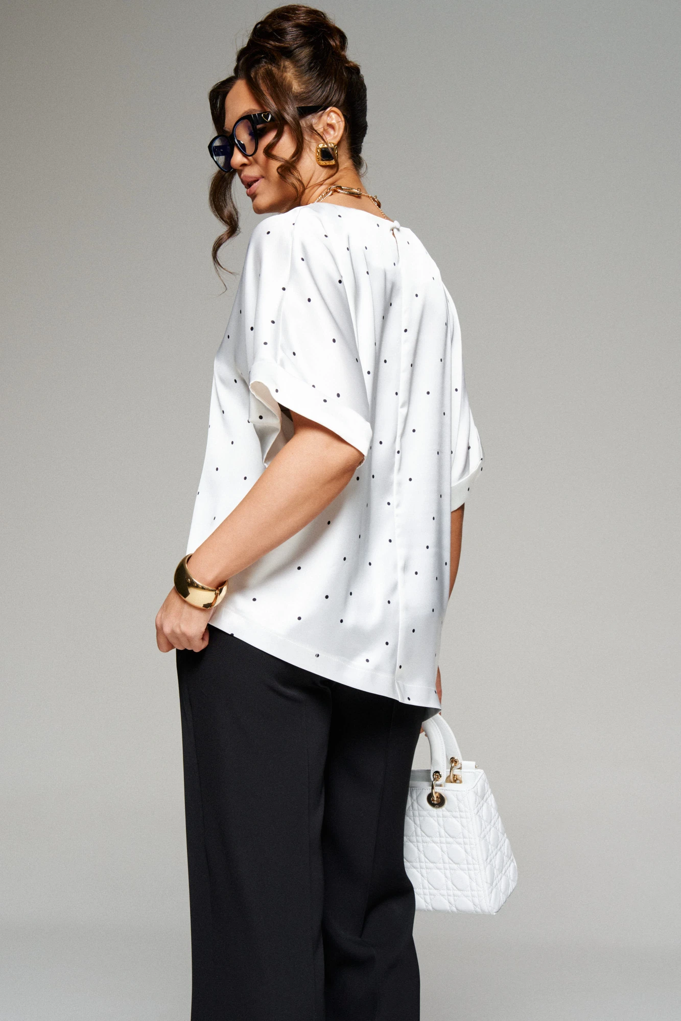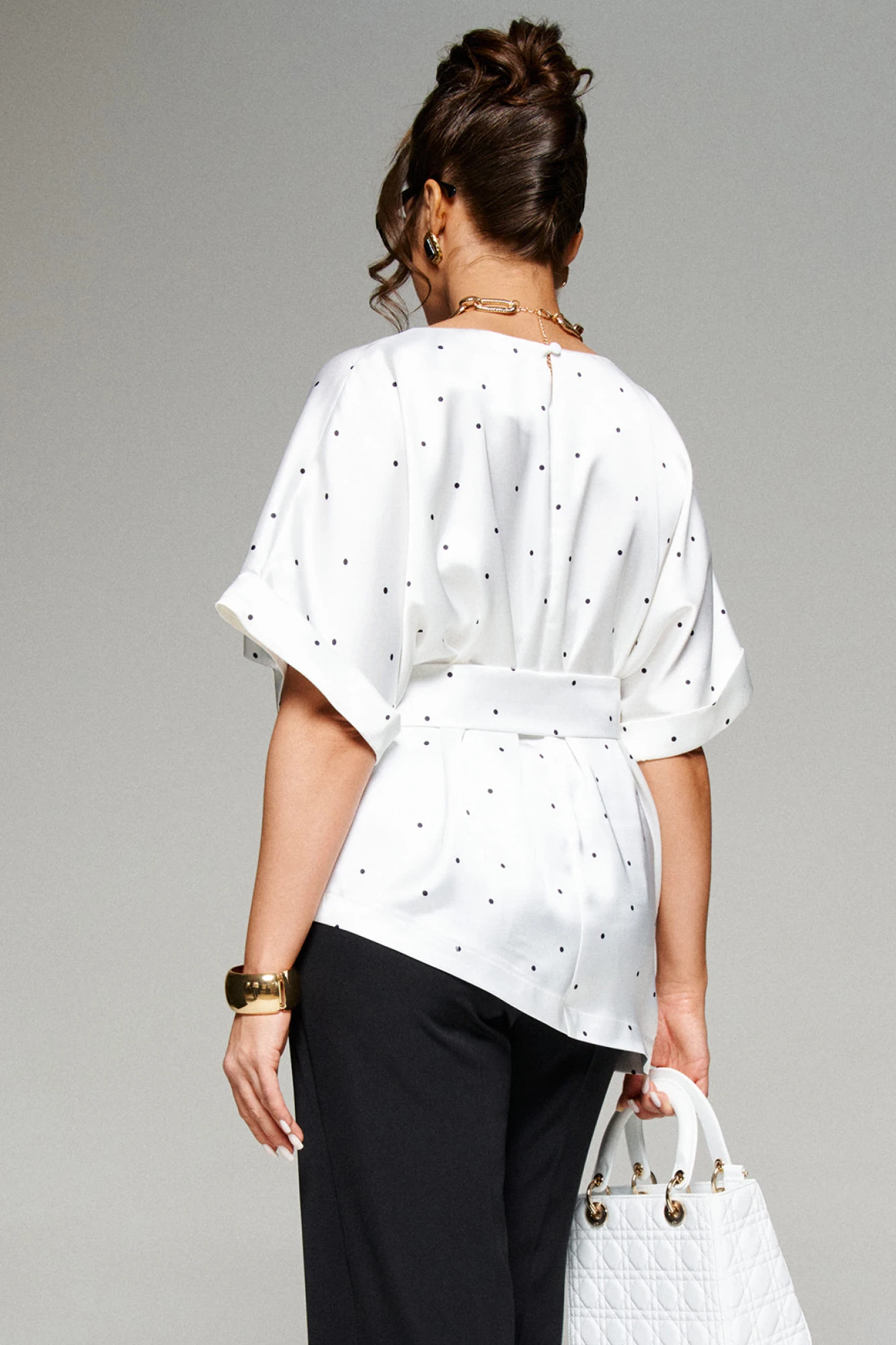 Блуза свободного кроя выполнена из ткани атлас, которая мягко облегает фигуру, а благодаря своему блеску придаёт изделию торжественный и презентабельный вид.