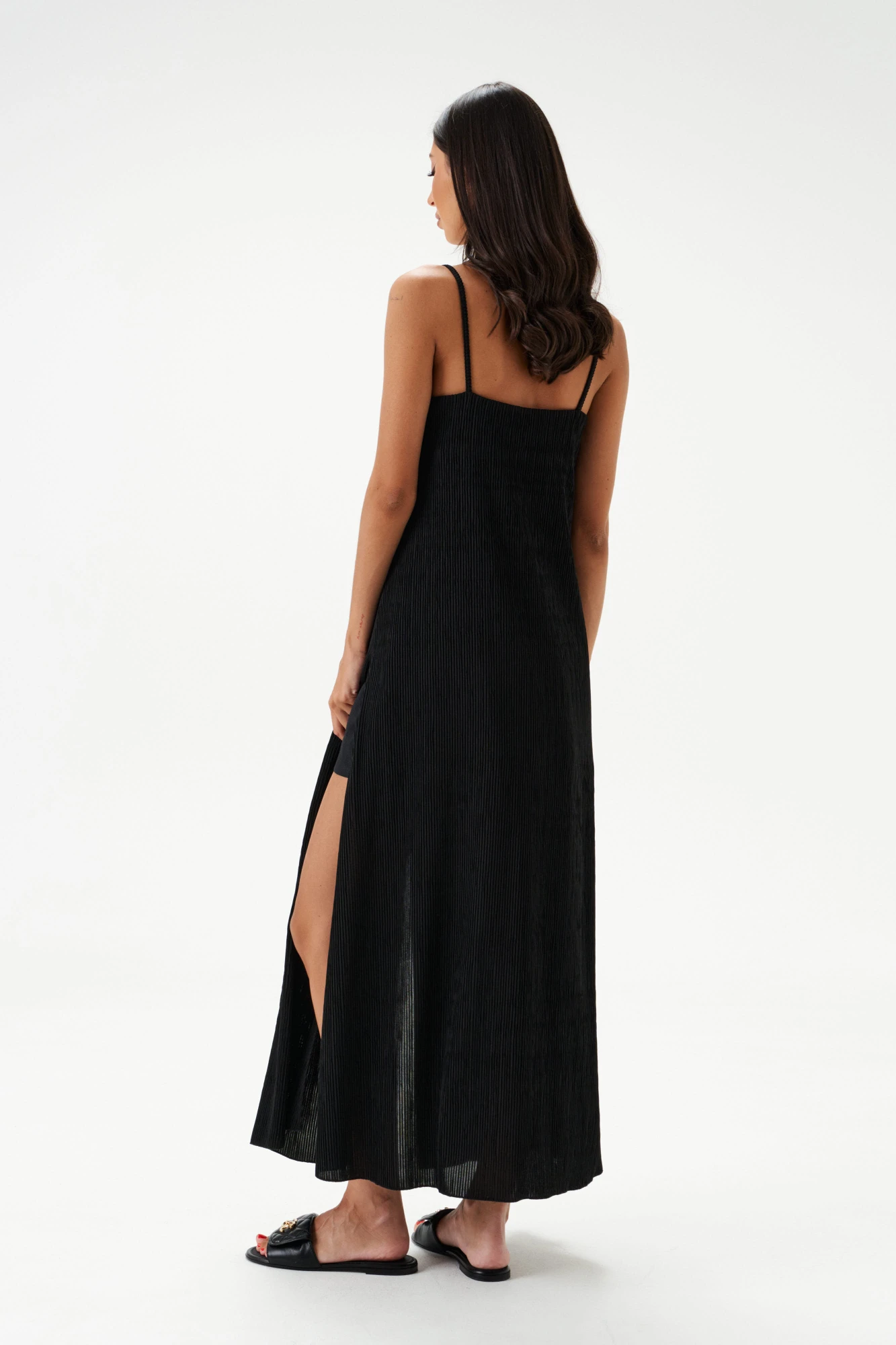 Блузон длины макси выполнен из полупрозрачного фактурного полотна черного цвета. Силуэт свободный. Бретели нерегулируемые. Лиф фигурный, двойной, по бокам выточки. Без подкладки. Застёгивается от груди на ряд пуговиц. Вырез в боковом шве 75 см. Длина по спинке 112 см.