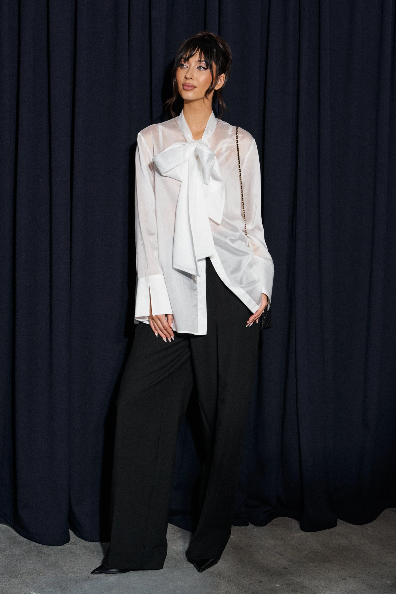 Блузка прямого кроя, выполнена из легкого струящегося полотна белого цвета. Характеристики: прямой крой, застежка центральная на петли пуговицы, втачной рукав с широкой манжетой по низу, воротник-стойка с бантовыми завязками по переду. Длина изделия по спинке 72 см, длина рукава от линии втачивания 63 см