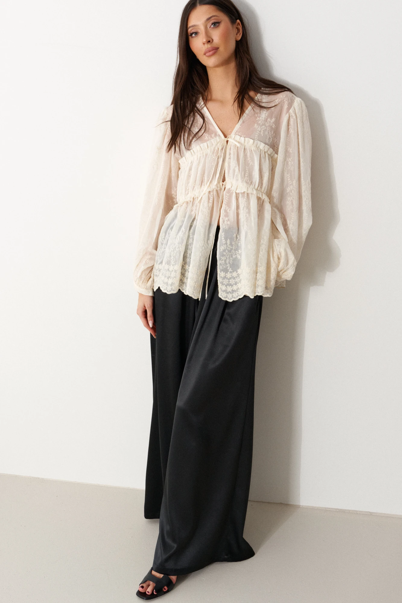 Блузка свободного кроя, выполнена из легкого натурального полотна с вышивкой молочного цвета. Характеристика: прямой свободный крой, V-образный вырез, рукав широкий вточной, низ присборен на фигурную узкую манжету, лиф отрезной по линии талии, застежка центральная на шнурки-завязки. Длина по спинке 64 см, длина рукава от края горловины 68 см