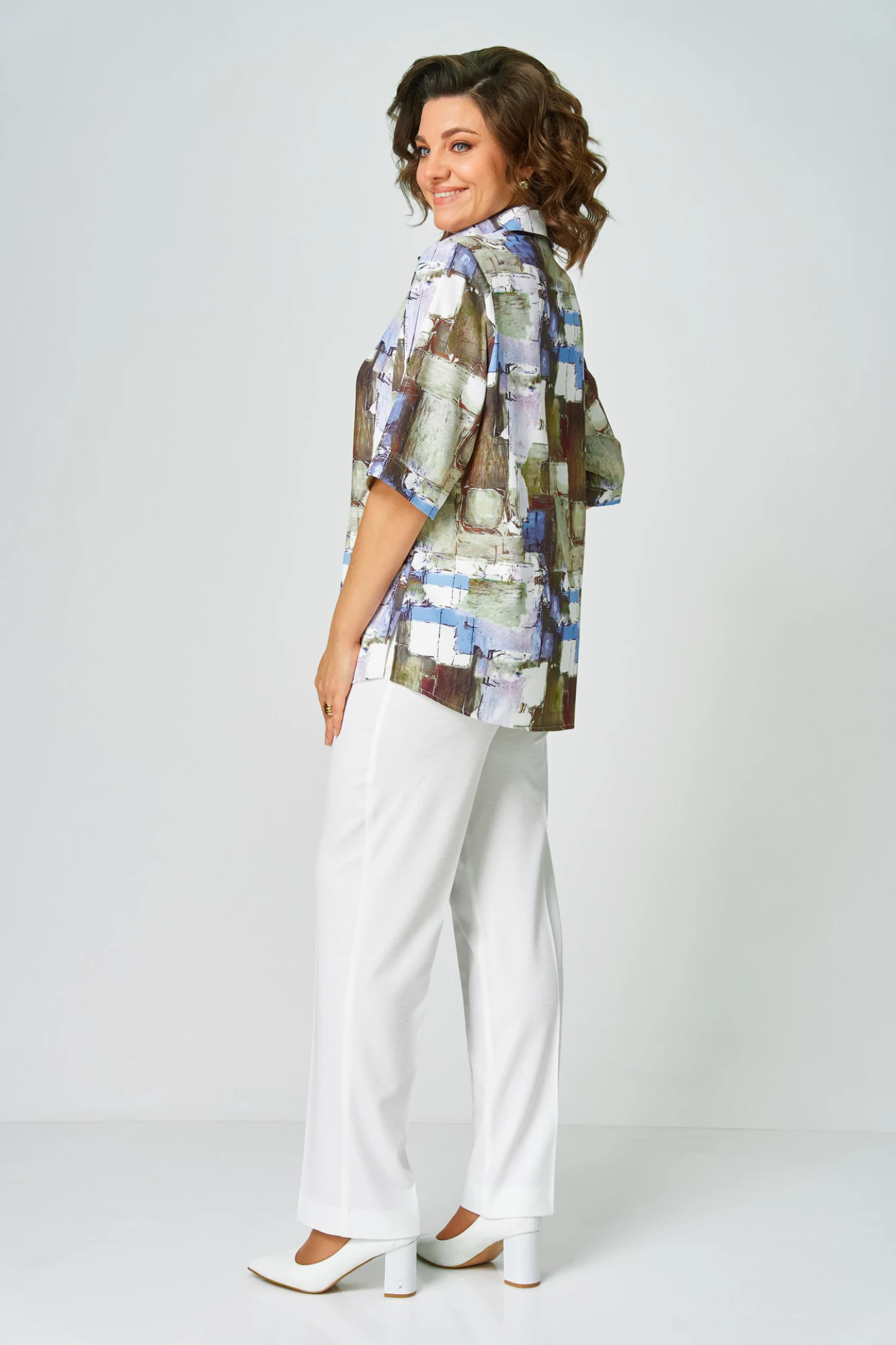Блуза прямого кроя, рукав короткий, по рукаву застрочены вертикальные защипы, отложной воротник, центральная застежка на петли-пуговицы, нагрудная вытачка, спинка цельная, боковые разрезы, идеальная блуза на каждый день. Длина рукава 37,5,длина по спинке 72.