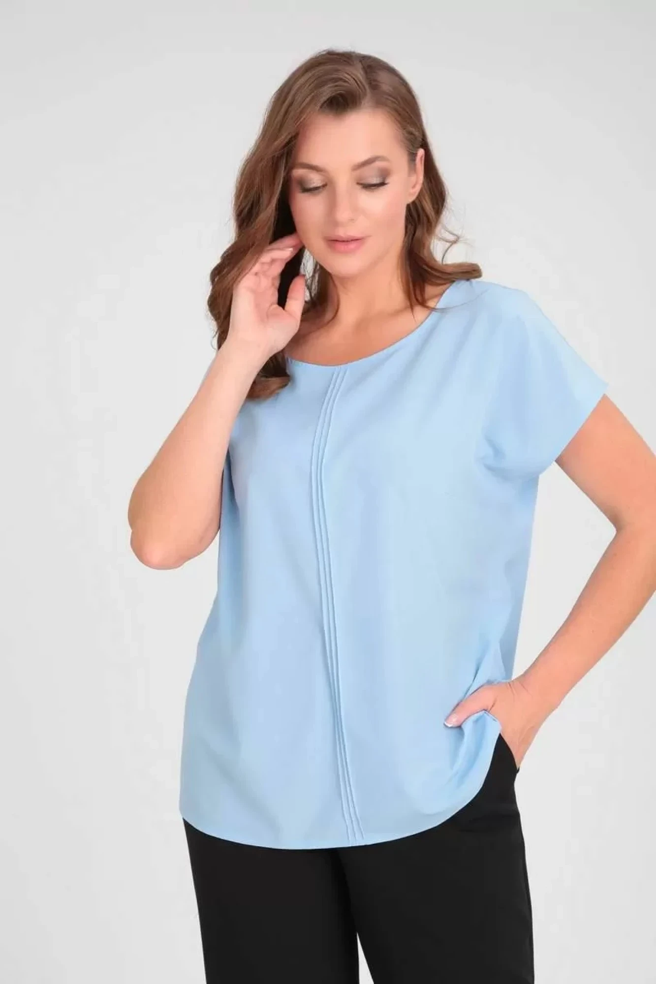 Блузка женская прямого силуэта, со спущенной линией плеча, с округлым вырезом горловины, имеются декоративные отсрочки по полочке. Блузка женская больших размеров станет настоящей находкой для повседневных комплектов в офис, на работу, для прогулок и торжеств.