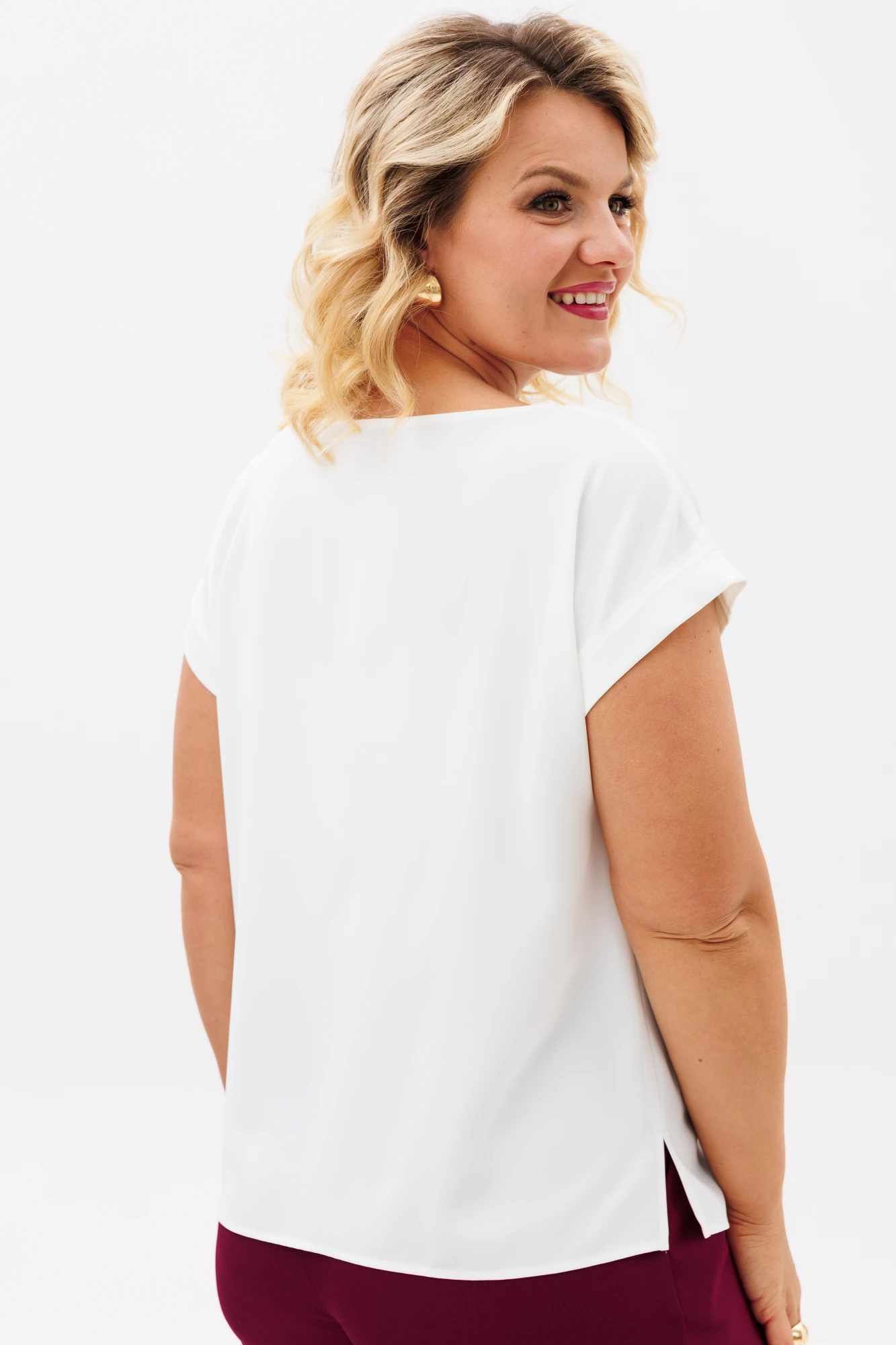 Базовая блузка из струящейся ткани. Блузка лаконичная с цельнокроеным коротким рукавом и с круглым вырезом горловины. В боковых швах разрезы. Изделие хорошо сочетается с брюками, юбками и джинсами, жакетами, а оптимальная длина блузки визуально уравновешивает фигуру. Отличный вариант под все базовые вещи в офис.