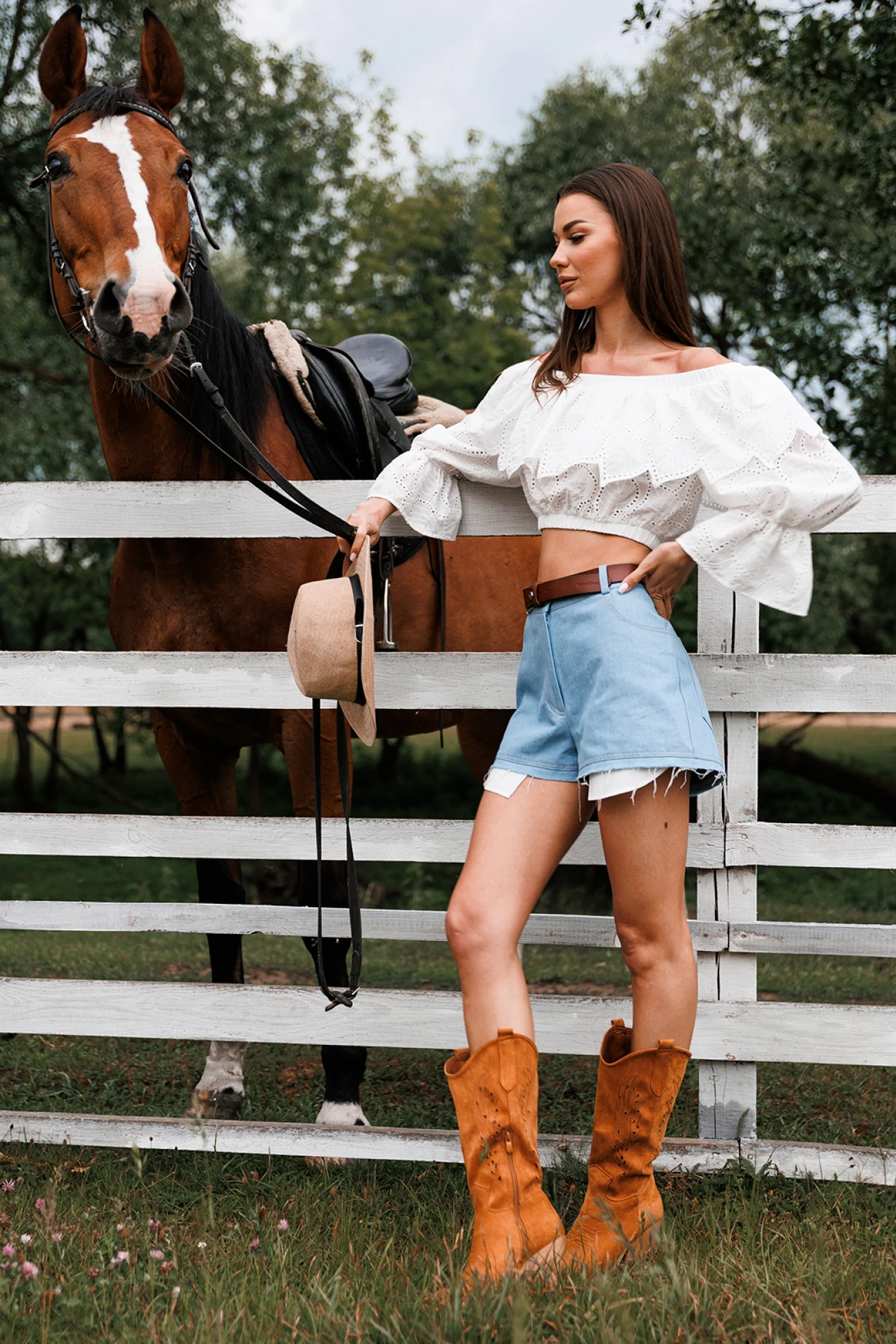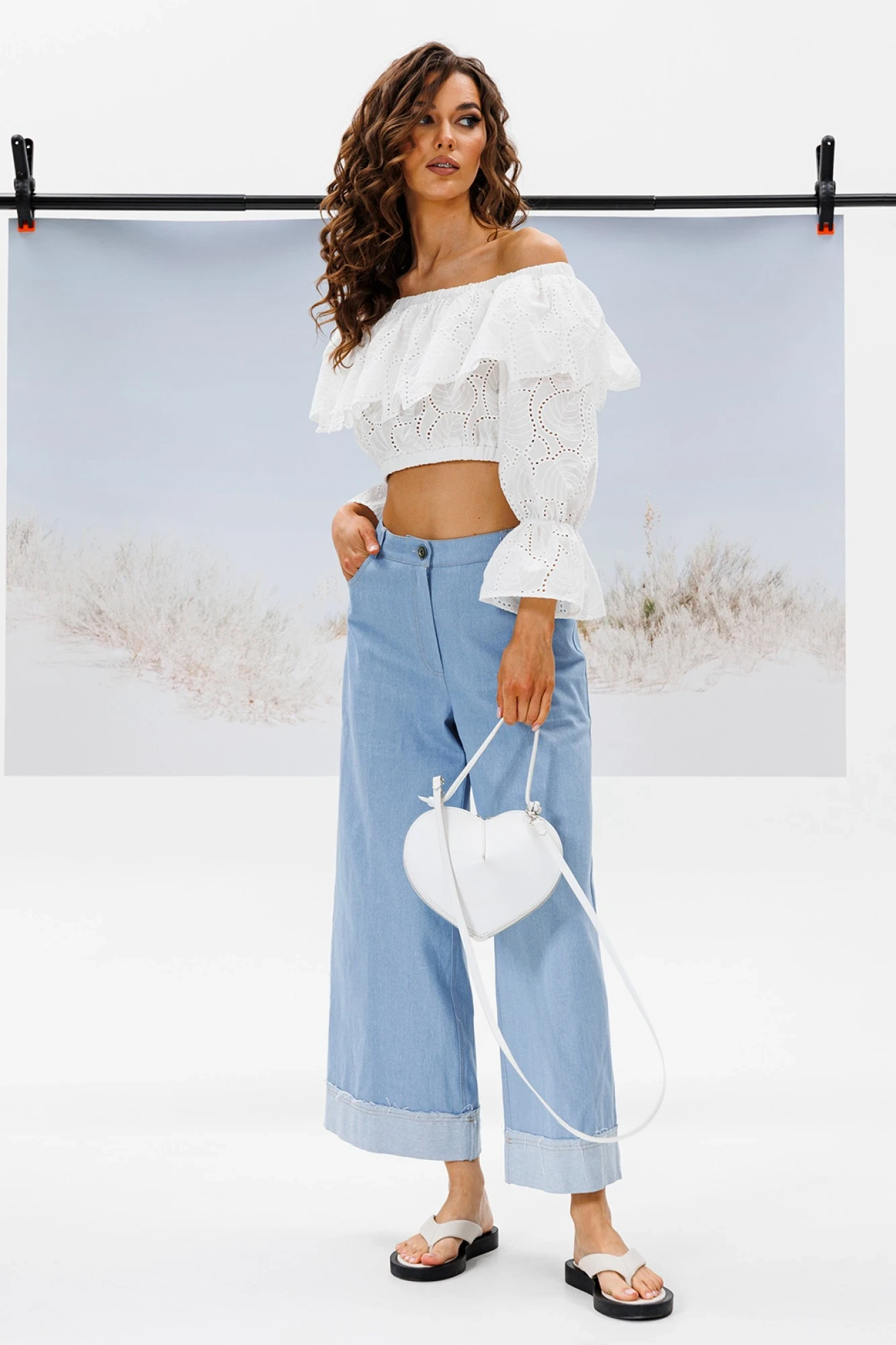 Блузка из хлопкового шитья укороченная на резинке по верху и по низу. По верху блузки волан. Рукав 7/8 на резинке по низу. Блузка без подкладки.