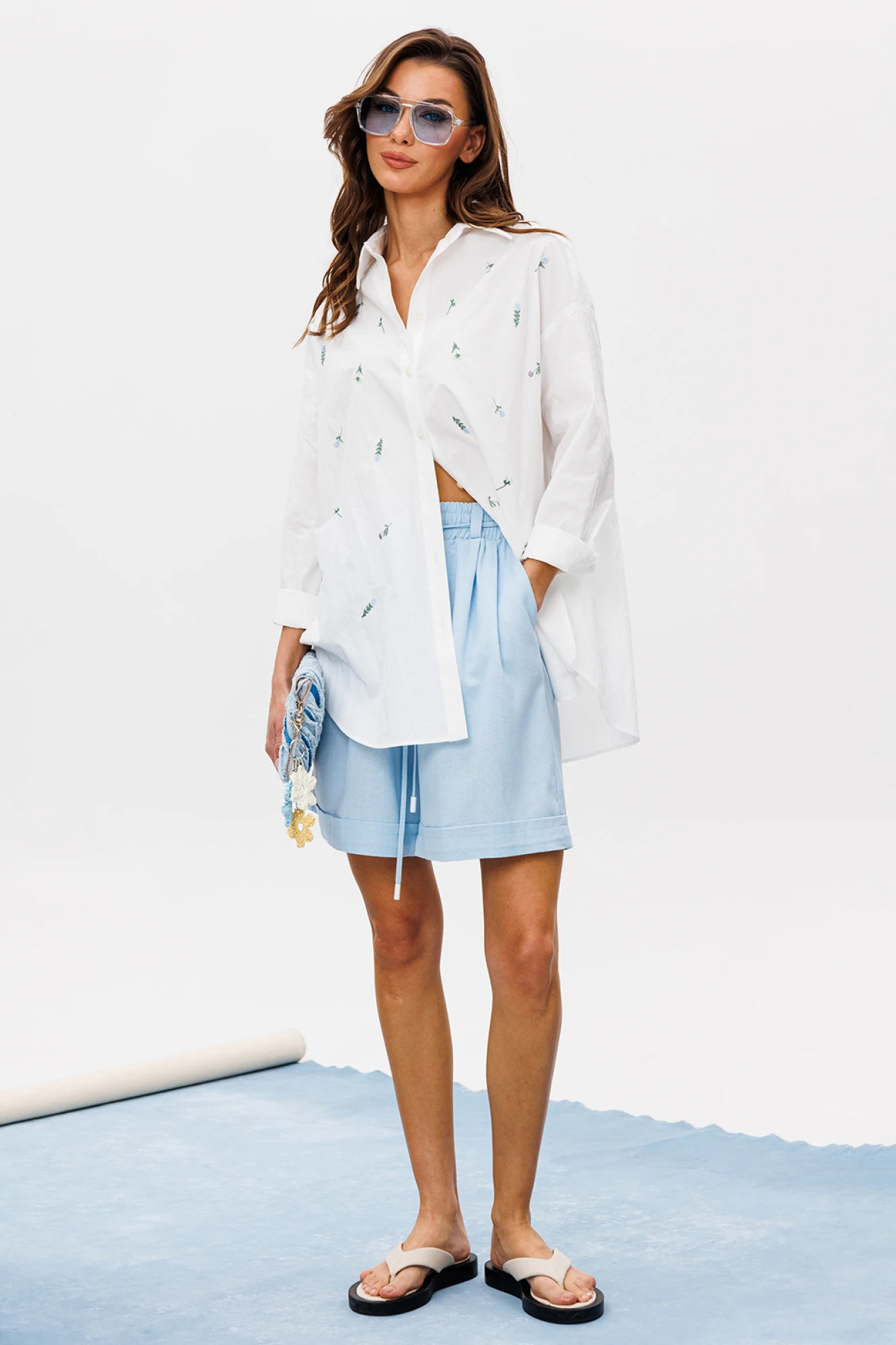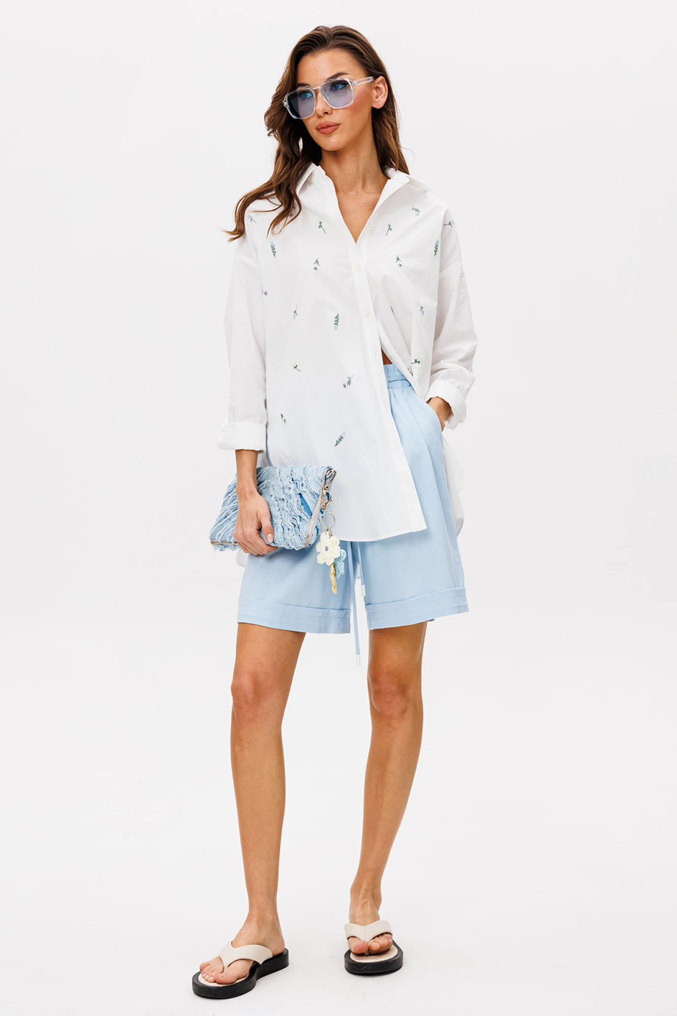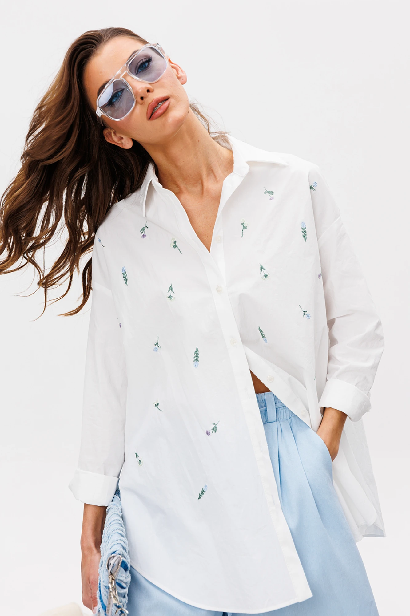 Блузка прямого силуэта, с втачным одношовным рукавом, внизу со складкой и манжетой, с застежкой на петлю-пуговицу. Полочка с застежкой по притачной планке на петли-пуговицы. По переду вышивка "Цветочки". По спинке кокетка и встречная складка от кокетки. Воротник рубашечный отложной на стойке. Спинка и полочка с фигурным низом. Внизу по боковым швам обработаны разрезы.