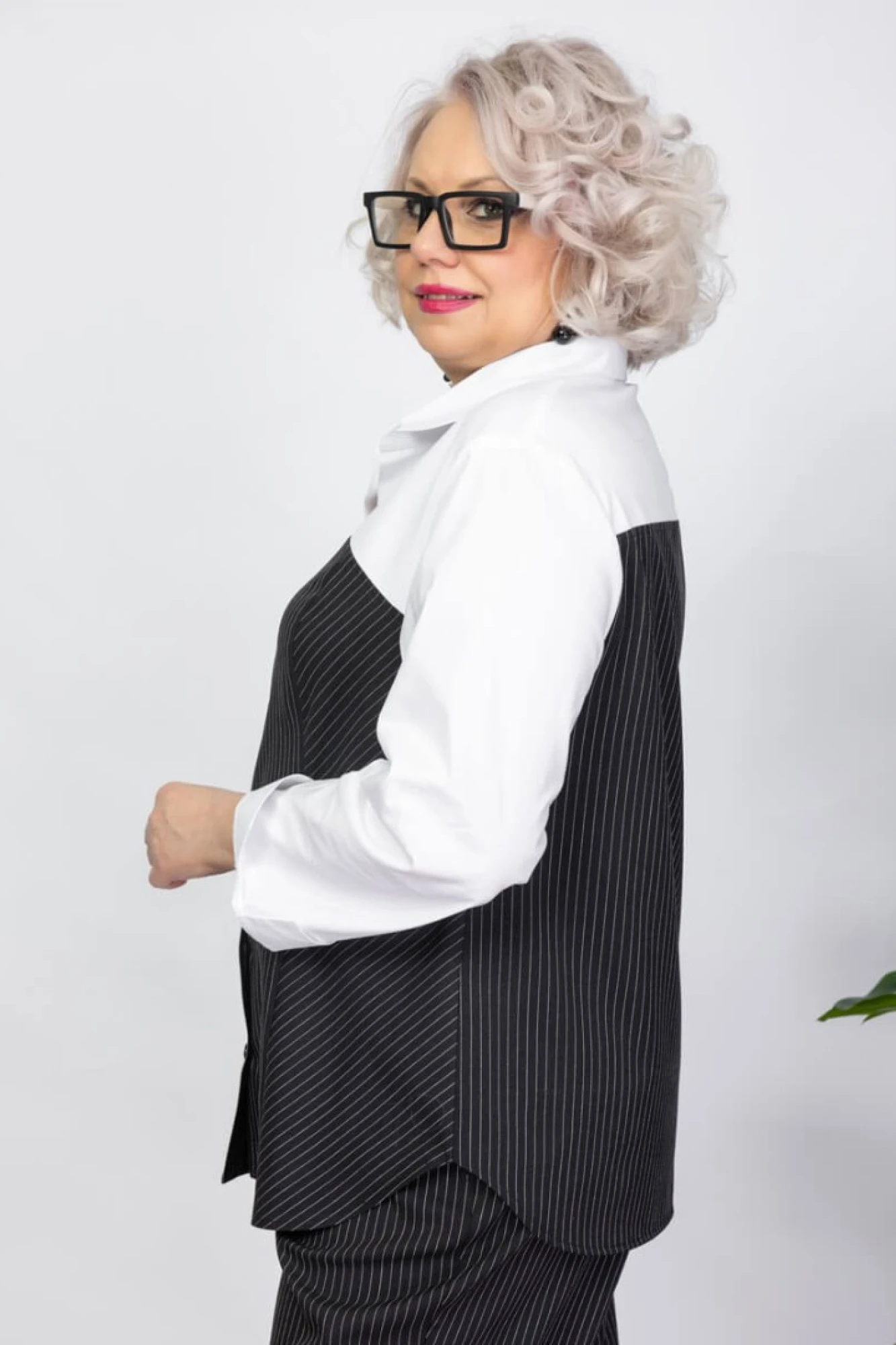 Оригинальная женская блузка выполнена из сочетания двух видов тканей – белого хлопка и текстиля в полоску. Женская рубашка прямого силуэта от Camelia отличный вариант для офиса и деловых встреч. А вместе с брючками 2362/5 получится стильный деловой костюм! В нашей рубашке Вы будете чувствовать себя свободно и уверенно, благодаря своей комфортной посадке и правильной длине (слегка закрывает линию бедер).