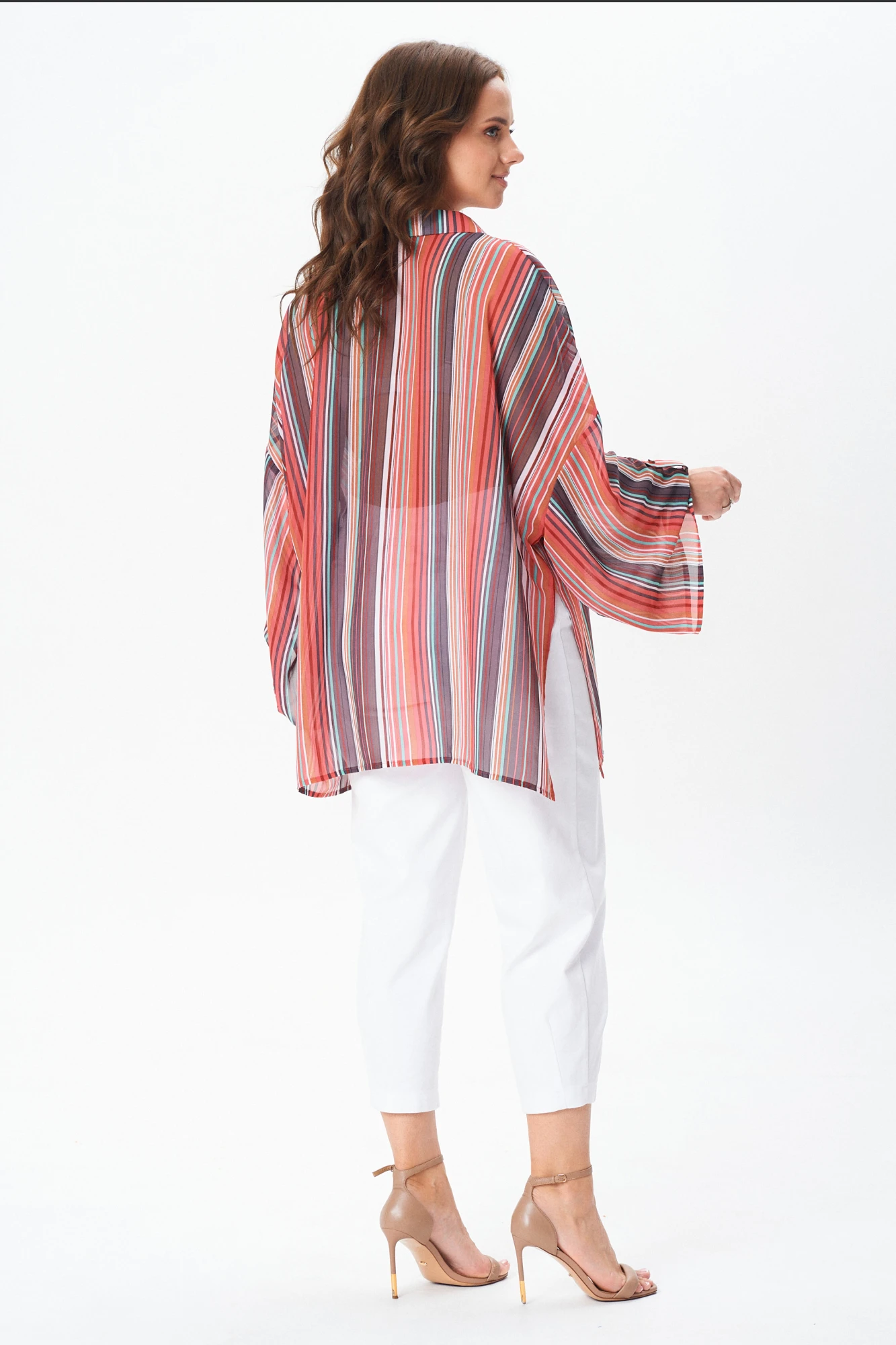 Блузка one size прямого силуэта со спущенным плечом. Рукав укороченный с «патой». Центральная застежка на петли-пуговицы. Воротник отложной с отрезной стойкой. По переду накладной карман в области груди. По боковым швам разрезы от линии талии.