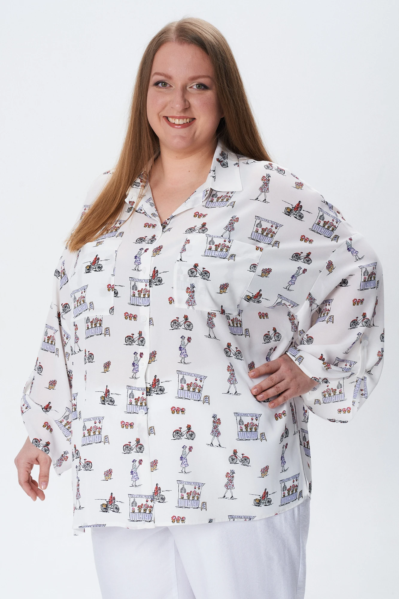 Блузка one size (рекомендуемые размеры 50-60) прямого силуэта со спущенным плечом. Рукав укороченный с «патой». Центральная застежка на петли-пуговицы. Воротник отложной с отрезной стойкой. По переду накладной карман в области груди. По боковым швам разрезы от линии талии.