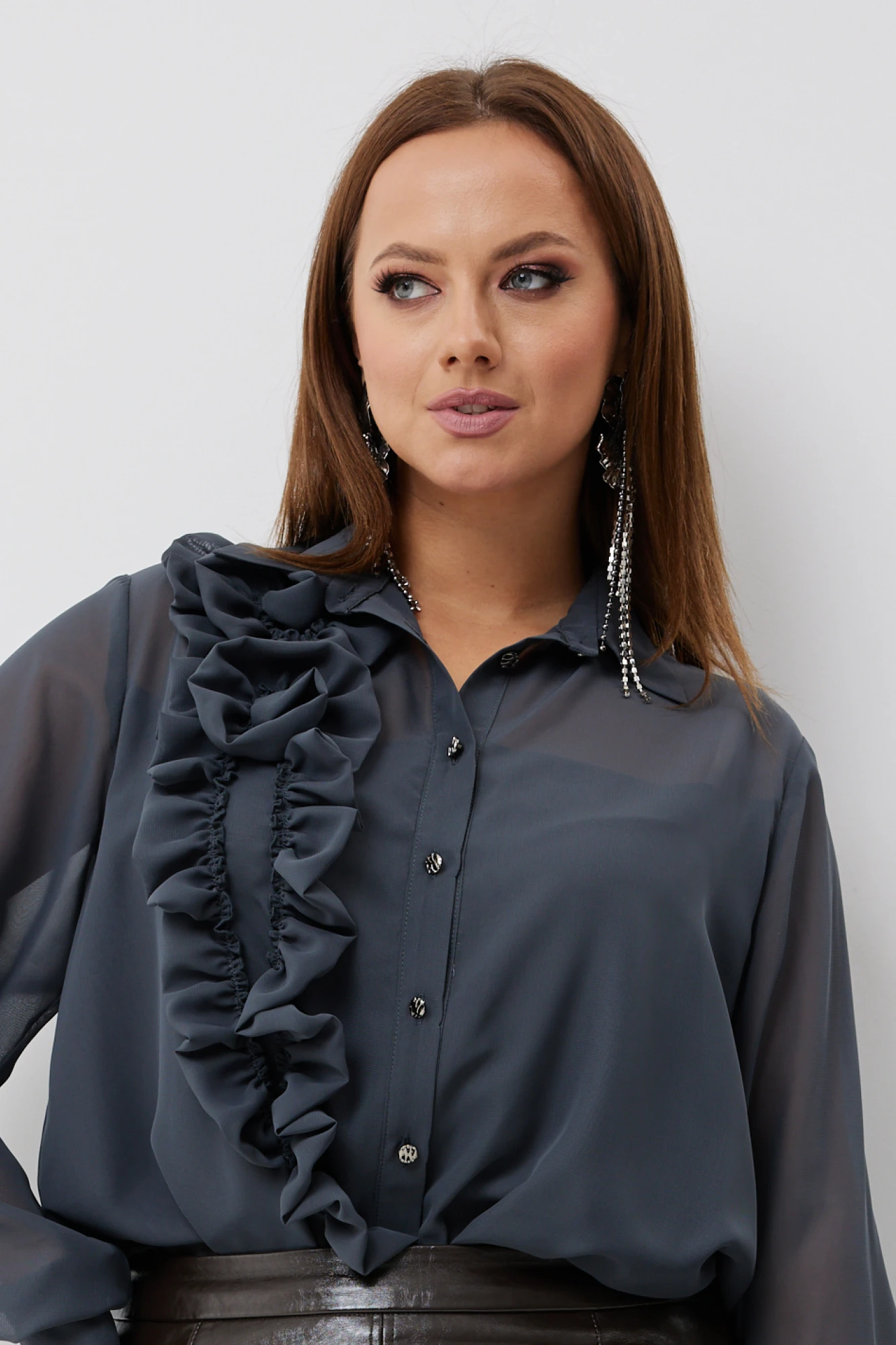 Эта изысканная блузка выполнена из нежного шифона и имеет прямой силуэт, который выгодно подчеркнет вашу женственность, блузка на подкладке. Она застегивается спереди на элегантные петли-пуговицы, что придает ей особый шарм. Блузка также украшена декоративными воланами на правой полочке, переходящими в красивый цветок, делая ее нарядной.