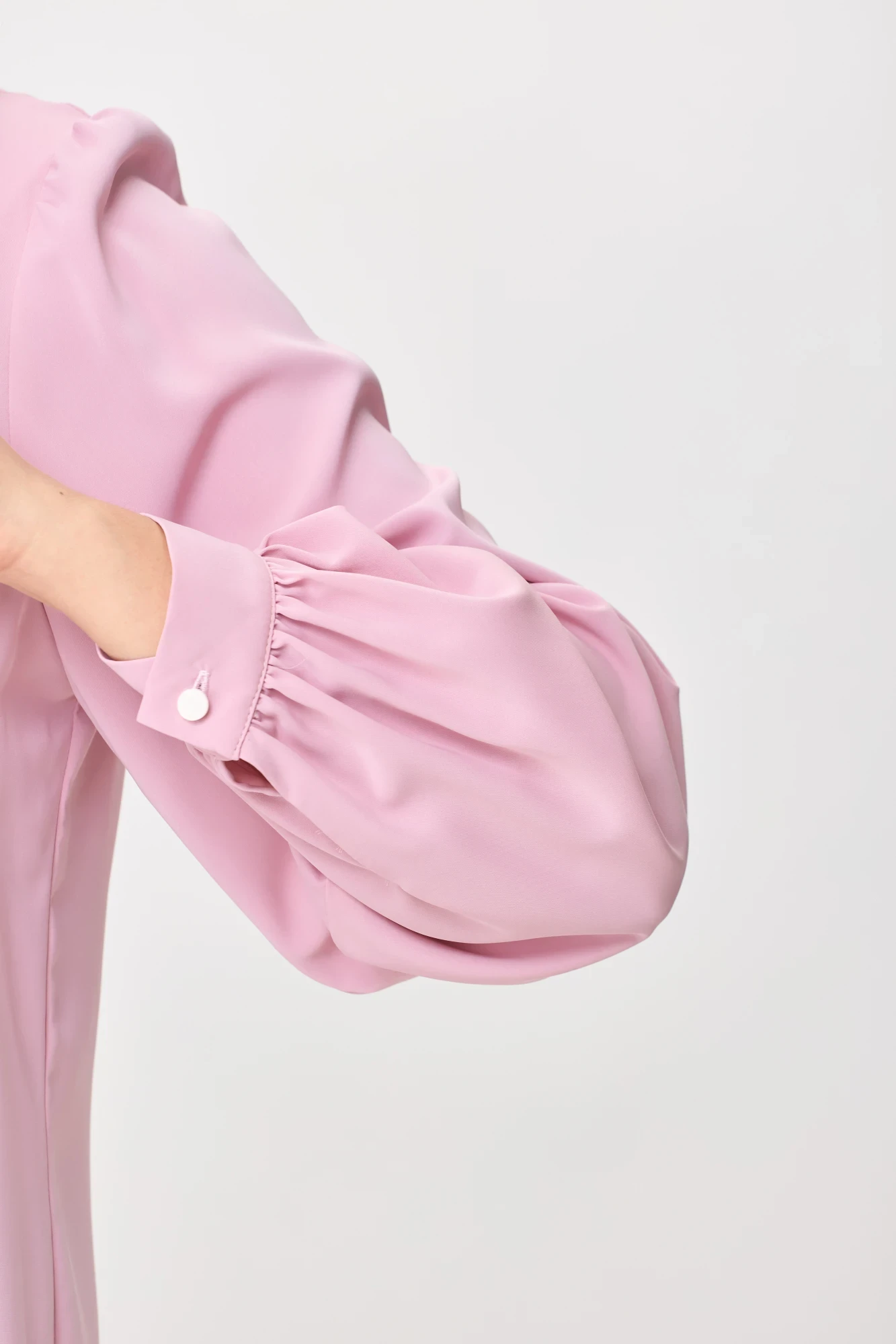 Рукав длинный, со сборкой по окату и по низу, заканчивающейся манжетой, с застежкой на петлю и пуговицу.