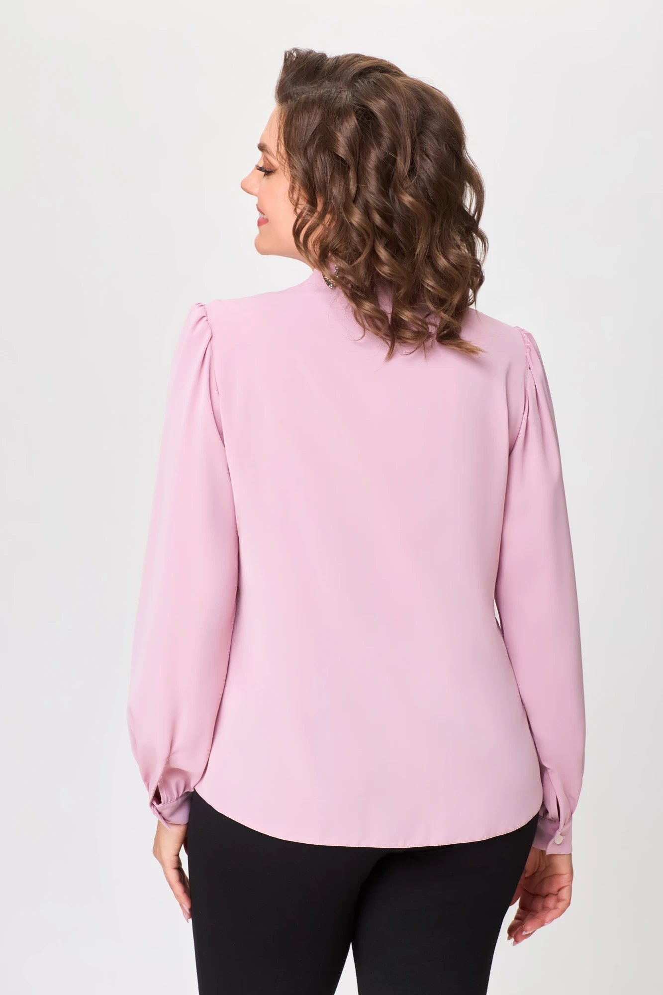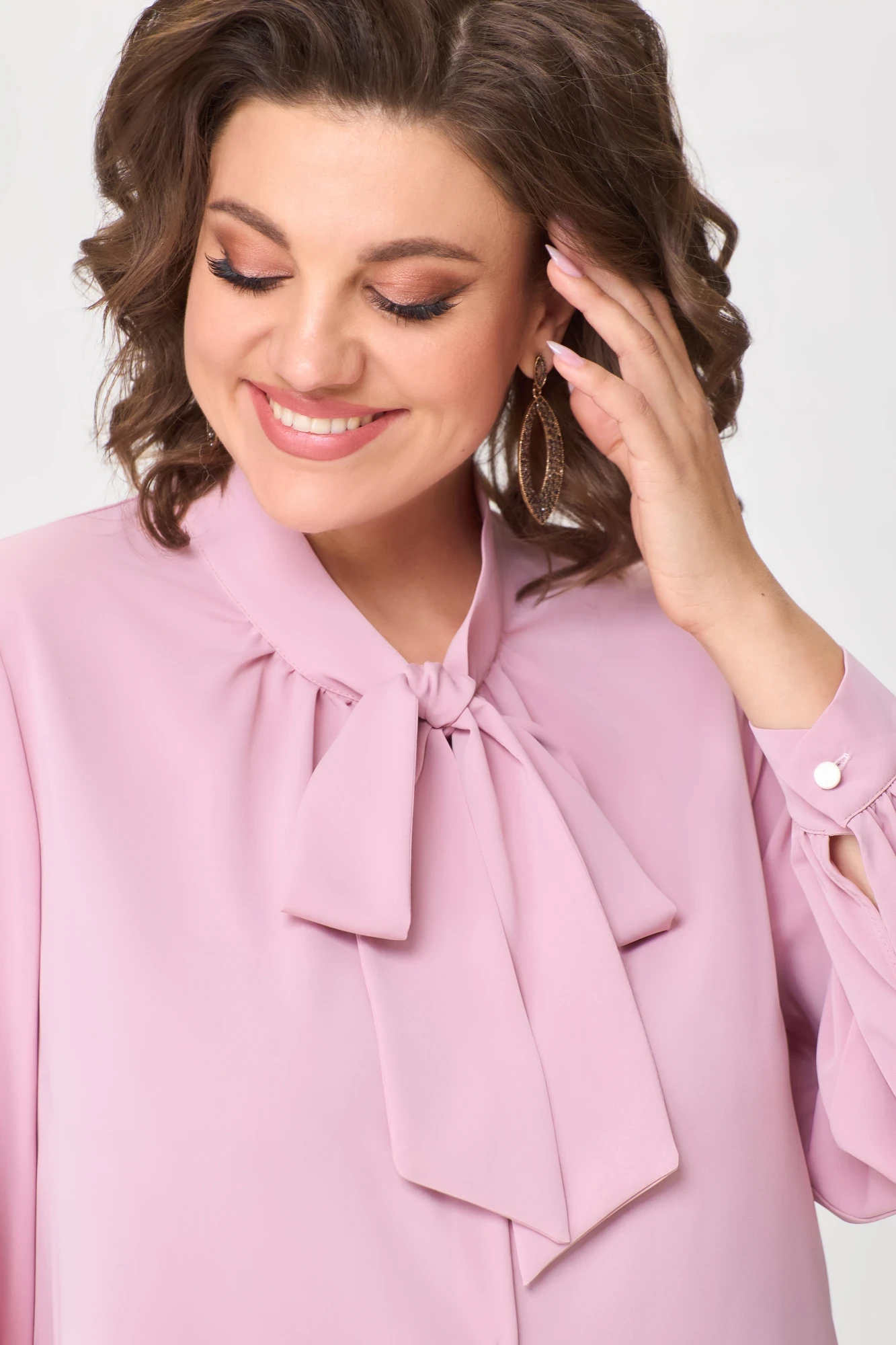 Блузка женская прямого силуэта, с центральной застежкой по переду на петли и пуговицы. По горловине переда-легкая сборка, воротник стойка, переходящая в бант.