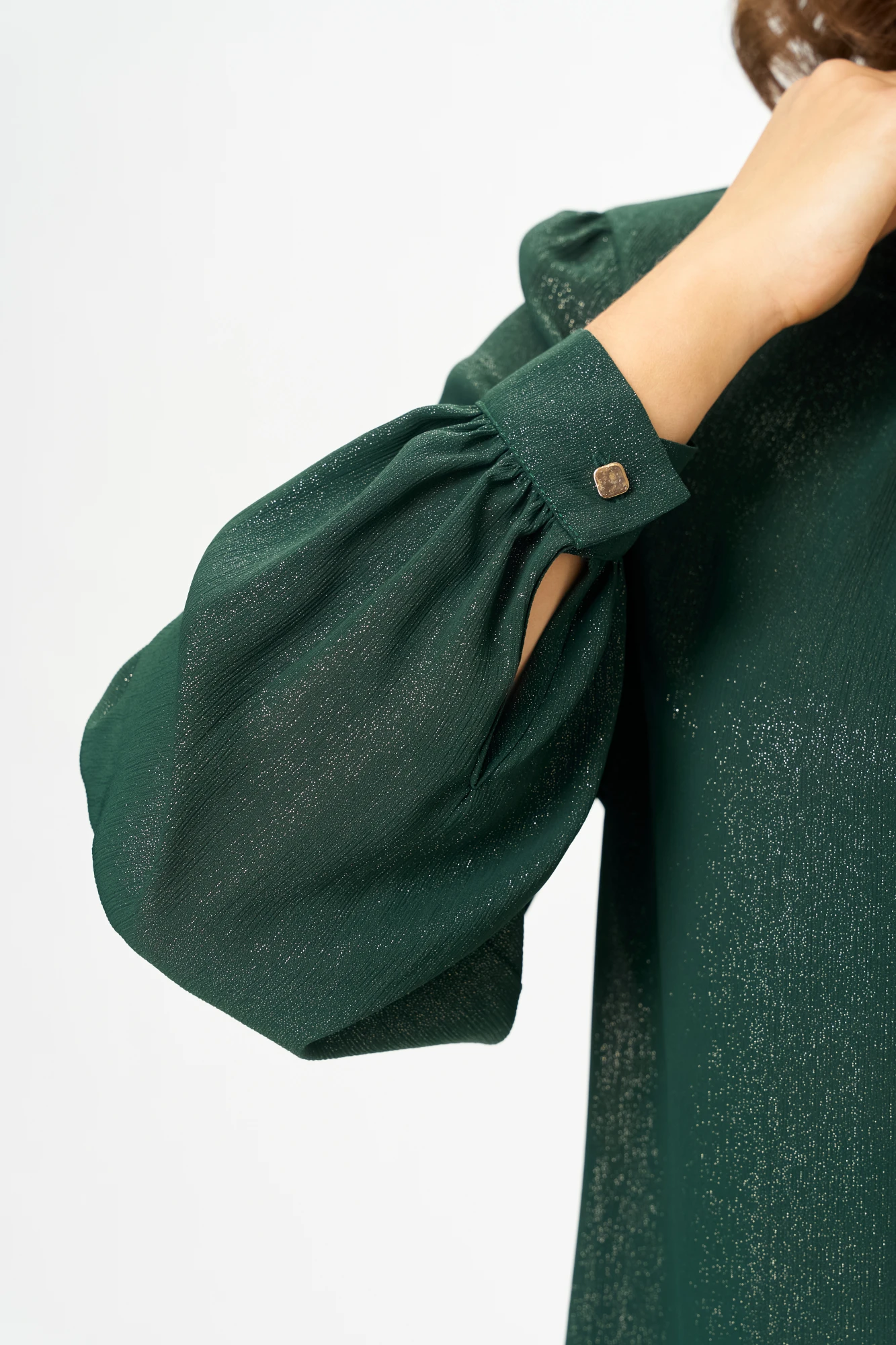Рукав длинный, со сборкой по окату и по низу, заканчивающейся манжетой, с застежкой на петлю и пуговицу.