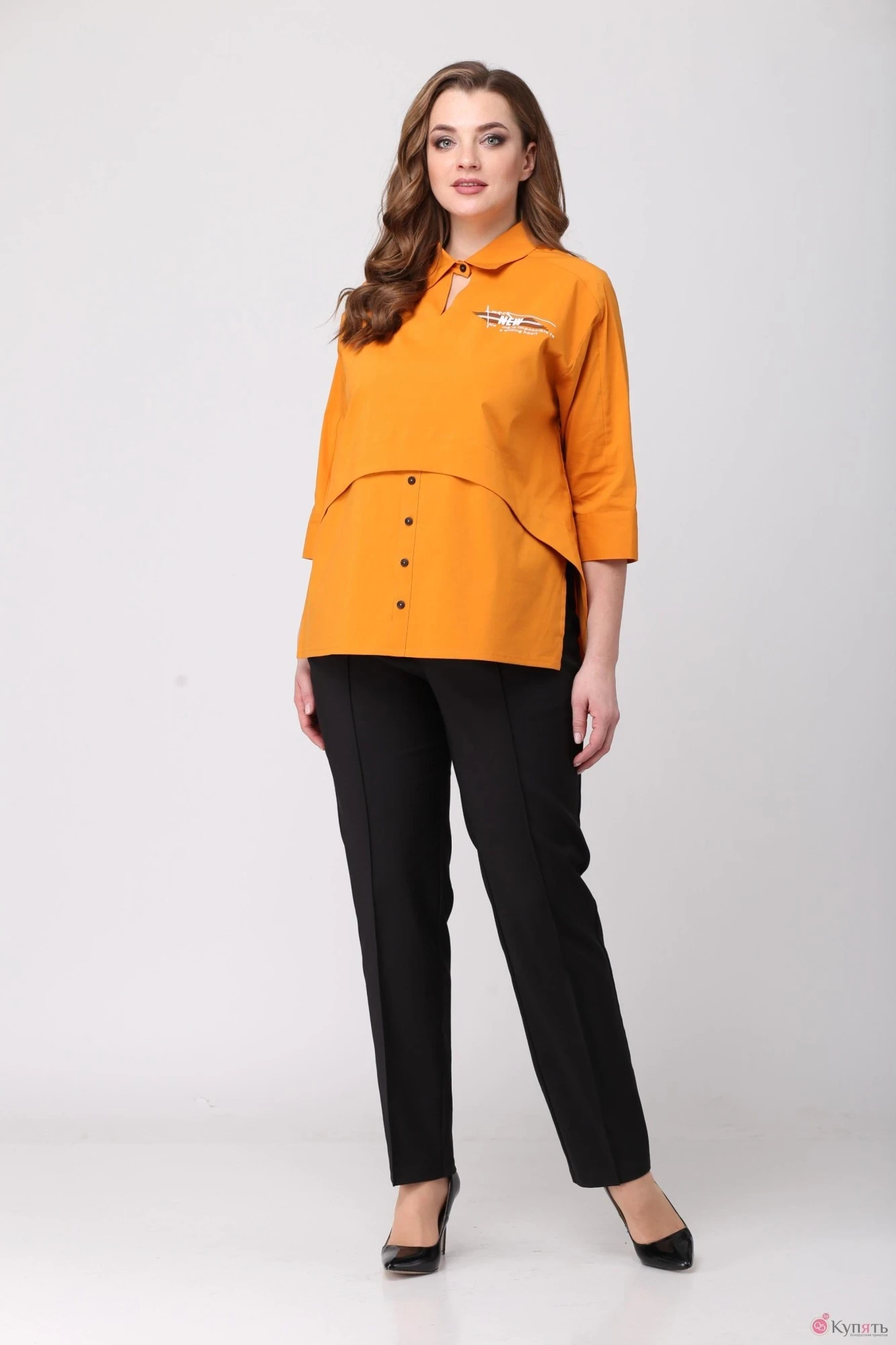 Эффектная блузка-рубашка в стиле оверсайз - настоящий «must have» , образ будет стильным в любом размере. Необычный сложный покрой блузки делает ее модной, а образ аховым... По переду полочки неглубокий разрез V-образной формы и воротник рубашечного типа с отрезной стойкой и застежкой на петлю-пуговицу. Верхняя часть переда отлетная, линия фигурная, соединяется по боковым швам с деталью спинки. Низ обработан фигурной бейкой. Нижняя часть переда выполнена с имитацией планки по переду и пуговицами , по бокам - разрезы. По центру спинки расположена неглубокая складка с декоративными пуговицами. Рукав с углубленной проймой и со спущенным окатом, по центру рукава расположен элемент детали, переходящий в кокетку по спинке. По низу рукава выполнен притачной манжет. Экспериментируйте с различными вариантами брюк, джинсами, шортами , Вы несомненно будете неотразимы и неповторимы!