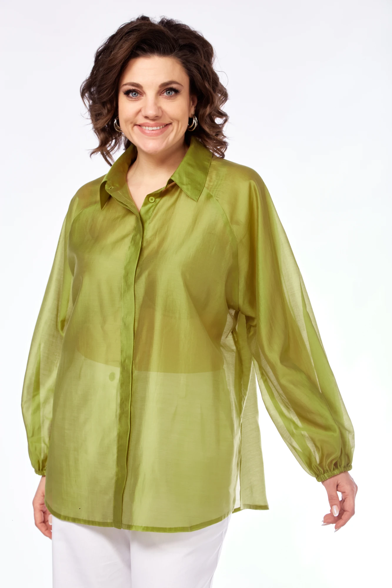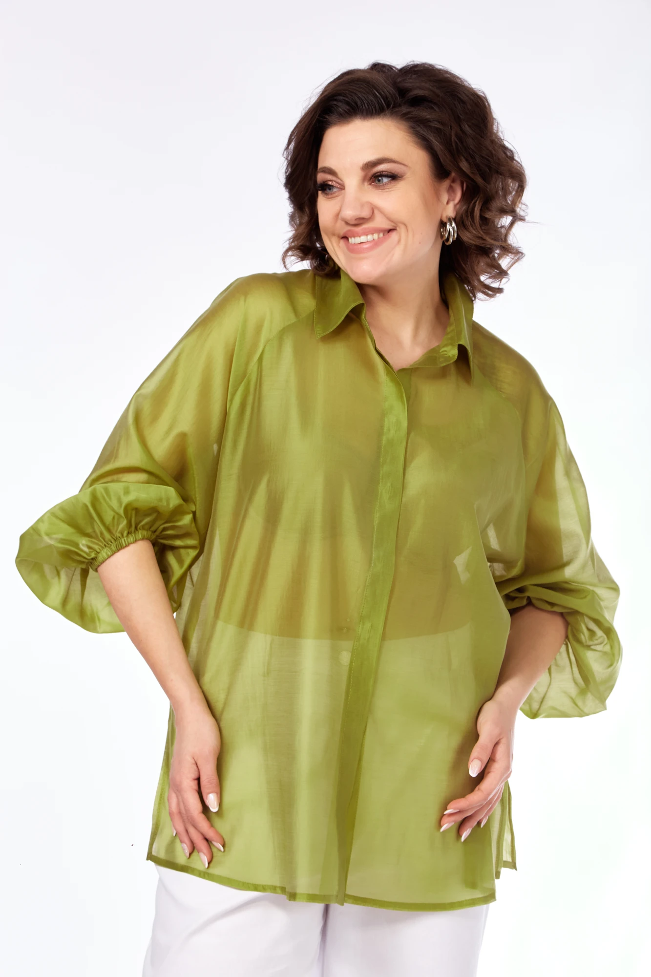 Блуза женская свободного кроя с центральной потайной застежкой на петли и пуговицы. Рукав реглан, собран по низу на резинку. Воротник стояче-отложной с отрезной стойкой. По боковым швам обработаны разрезы.