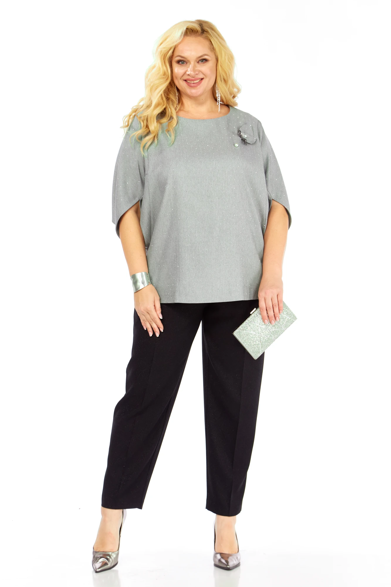 Уникальная блуза, сочетает в себе изысканный дизайн и комфорт. Прекрасно подойдет для праздничных мероприятий. Блуза полуприлегающего кроя из ткани на поверхности которой присутствует легкое элегантное мерцание кристаллов. Горловина аккуратной округлой формы. Эффектные рукава с фантазийным решением — усиливают модный акцент и придают дополнительный шарм. Декоративным элементом является съемная дизайнерская брошь.
