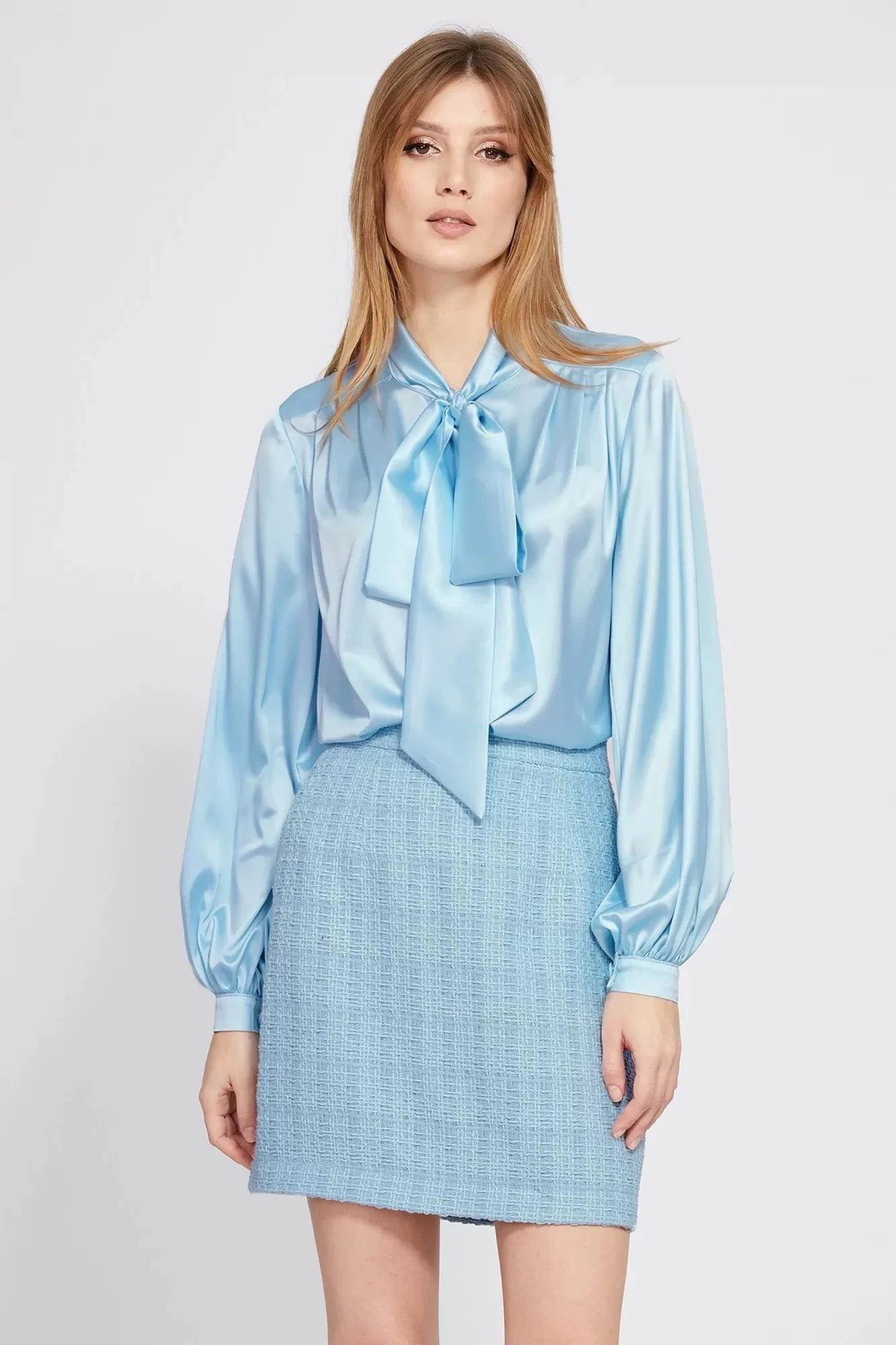 Блузка выполнена из атласа. По переду на кокетке. Рукав втачной расширенный книзу, присборен на манжет, с застежкой на две пуговицы. В боковых швах разрезы. Воротник на стойке, переходящий в завязывающийся бант спереди.
