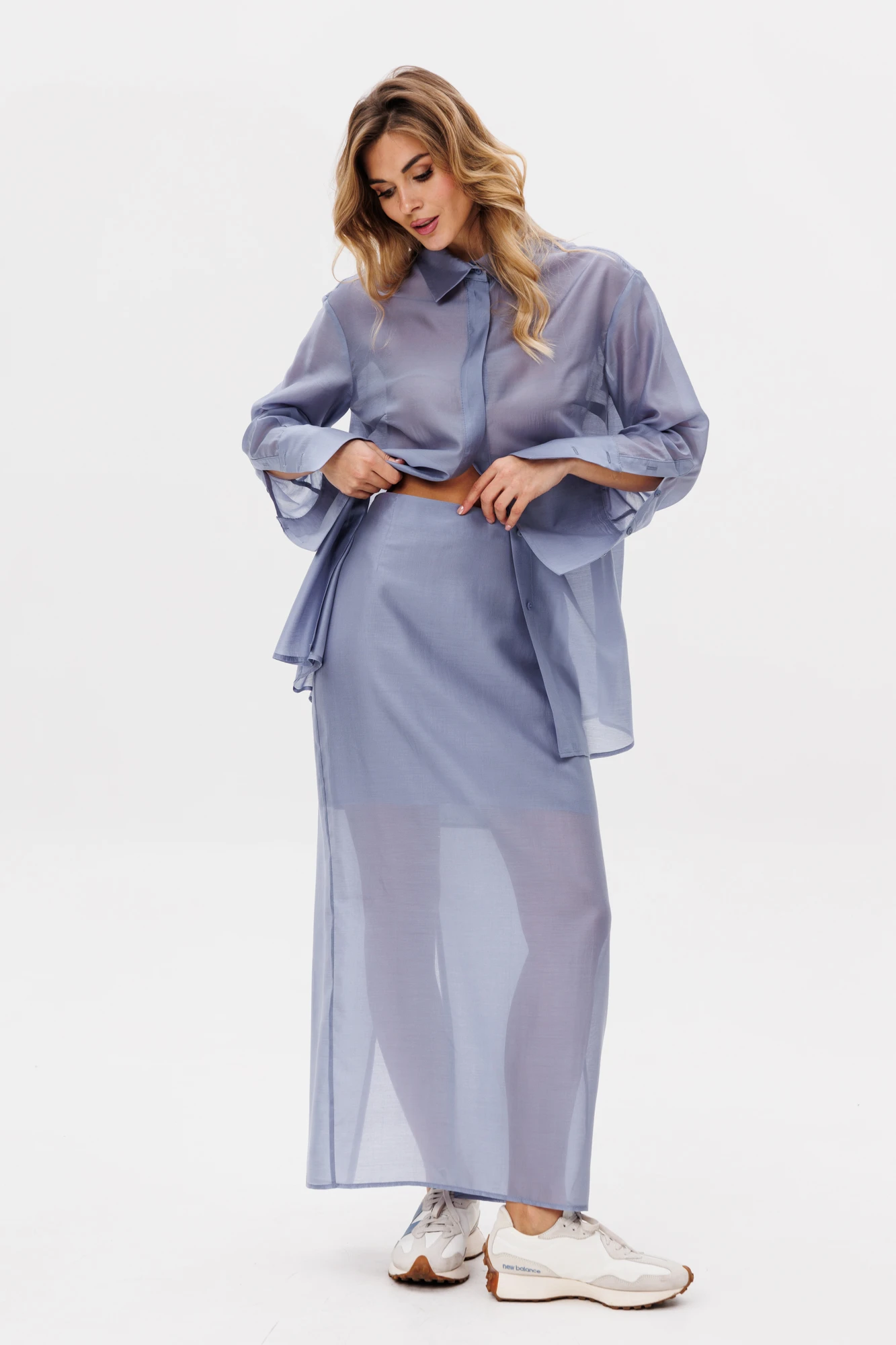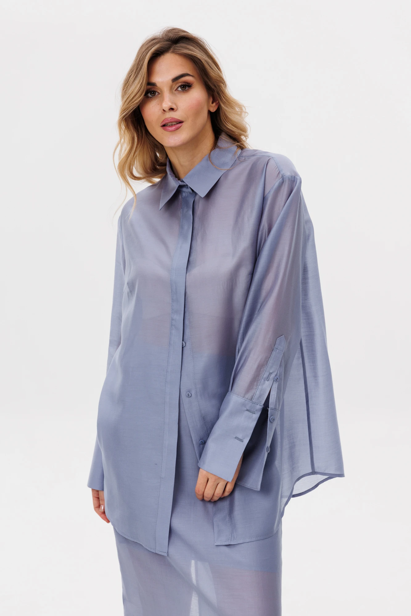 Блузка выполнена из плательно-блузочной ткани. Блузка прямого силуэта, длиной ниже линии бедер. Спереди застежка на пуговицы и потайную планку. Спинка цельная. Воротник стояче-отложной. Плечевой шов удлинен. Рукав рубашечного покроя, одношовный. Низ рукава на притачной манжете. Низ блузки фигурной формы.