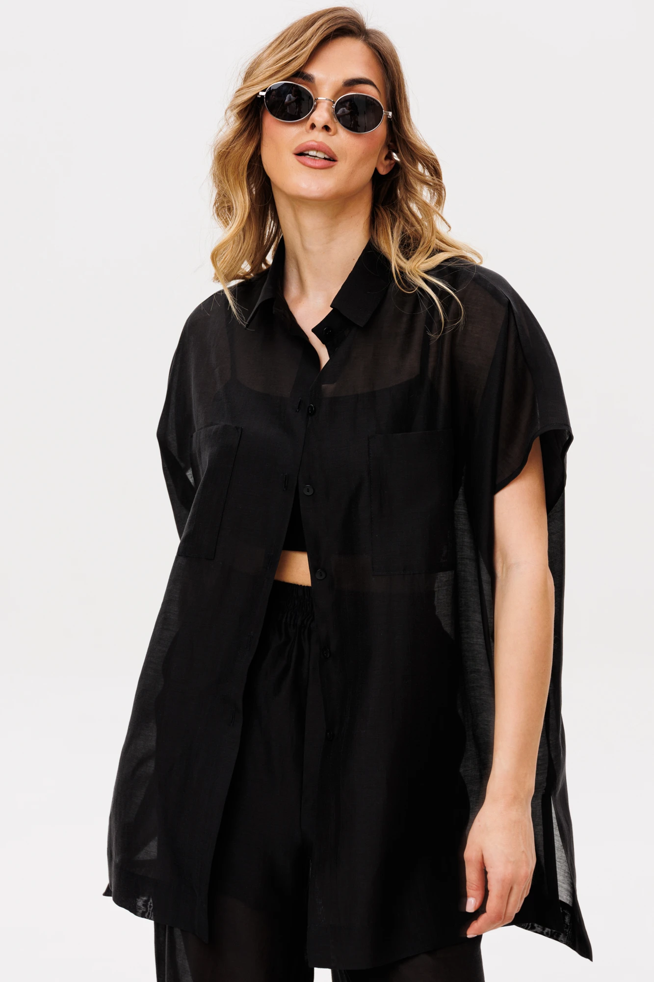 Блузка выполнена из плательно-блузочной ткани. Блузка прямого силуэта, длиной ниже линии бедер. Спереди центральная застежка на пуговицы с цельнокроеной планкой, и накладные нагрудные карманы. Спинка цельная. Воротник стояче-отложной с отрезной стойкой. Плечевой шов удлинен. В боковых швах разрезы. Спинка длиннее переда.
