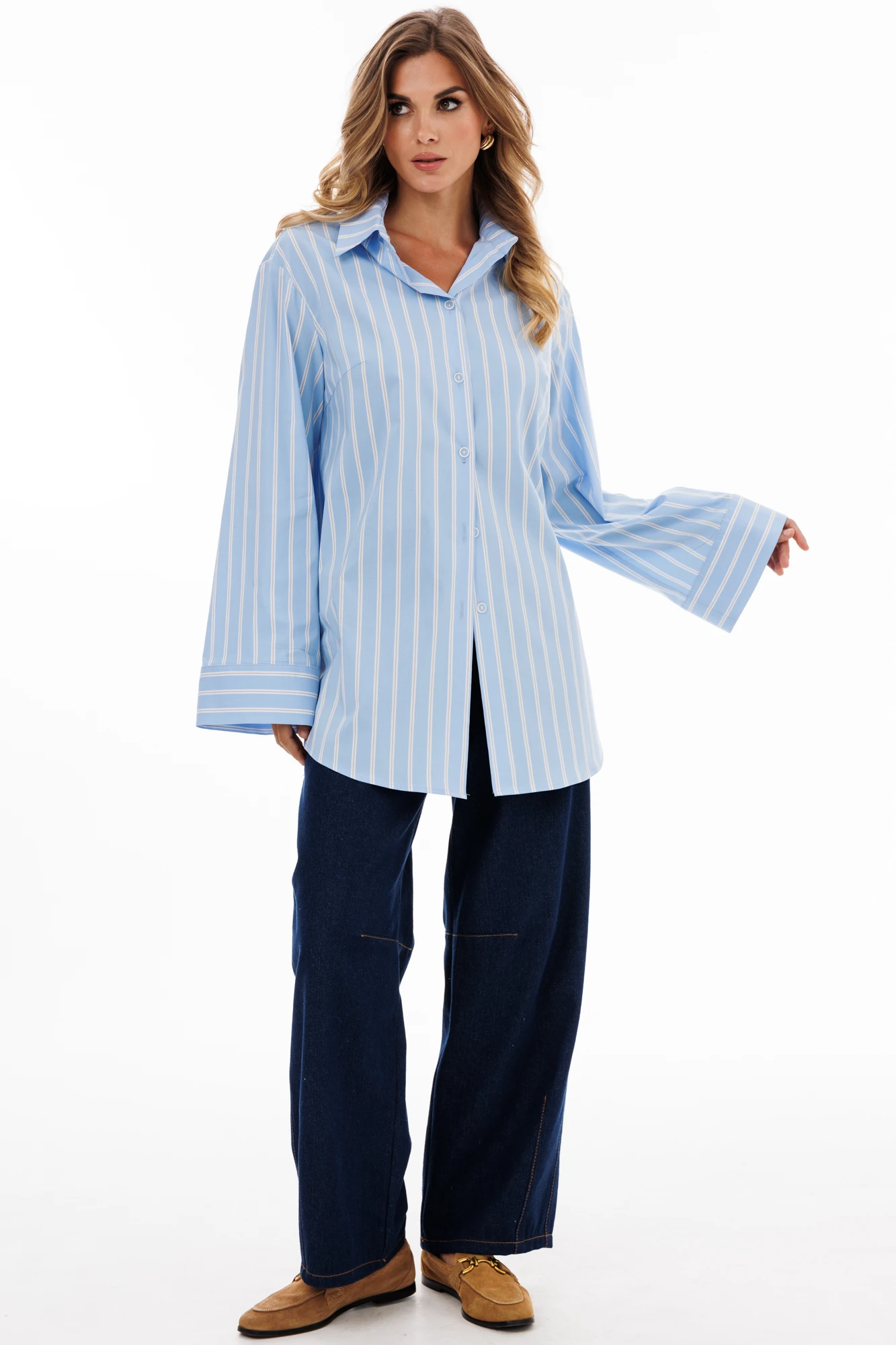 Блузка выполнена из блузочной ткани в полоску. Блузка прямого силуэта, длиной ниже линии бедер. Спереди центральная застежка на пуговицы. Спинка цельная. Вортник стояче-отложной с отрезной стойкой. Плечевой шов удлинен. Рукав рубашечный, одношовный. Низ рукава на широкой манжете. В боковых швах разрезы. Низ блузки фигурной формы.