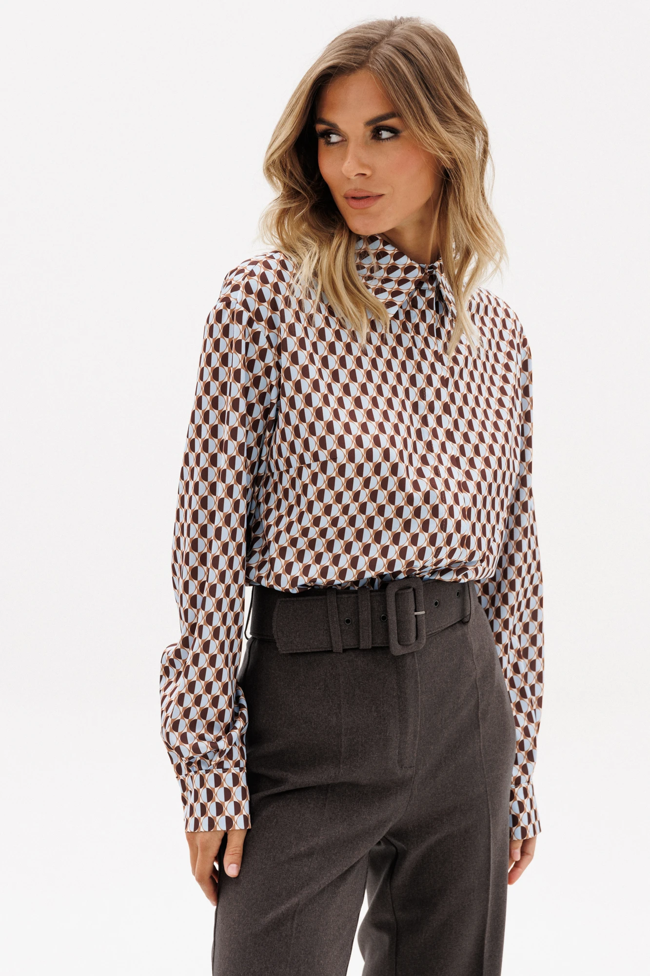 Блузка выполнена из тонкого атласа с принтом. Спереди центральная застежка на потайную планку с пуговицами. Спинка цельная. Воротник стояче-отложной. Плечевой шов удлинен. Рукав рубашечный одношовный. Низ рукава на притачной манжете.